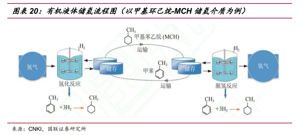 有机液体储氢优势在于:加氢后的有机氢化物性能稳定,安全性高,可常温常压 储存,储存方式与石油相似,质量储氢密度高,可达 5.0-7.2%/wt。其劣势在于:氢气纯度不高,有几率发生副反应,产生杂质气体;反应温度较高、脱氢效率较低、催化剂易被中间产物毒化;液氢储存压缩能耗过大,需配备相应的加氢、脱氢设备。 未来的技术突破方向是:提高低温下有机液体储氢介质的脱氢速率与效率、催化剂反应性能,改善反应条件、降低脱氢成本及操作难度。