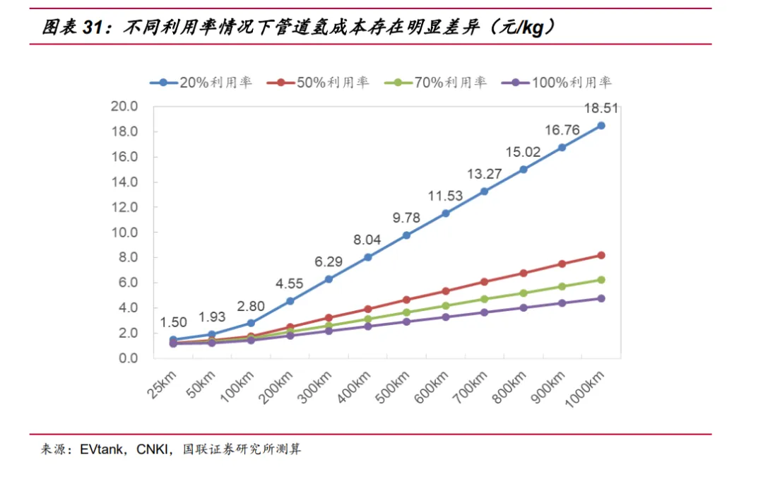 管道氢成本很大程度上受到需求端(利用率)的影响。在上述管道氢成本预测中,我们假设管道运能的利用率达到 100%,在这种水平下,管道氢运输成本表现出非常低的水平,但随着利用率水平的下降,管道氢成本陡然上升,当运能利用率仅为 20%时,管道运氢的成本已经接近长管拖车运氢。在当前加氢站尚未普及、站点较为分散的情况下,管道运氢的成本优势并不明显。随着氢能产业逐步发展,氢气管网终将成为低成本运氢方式的最佳选择。