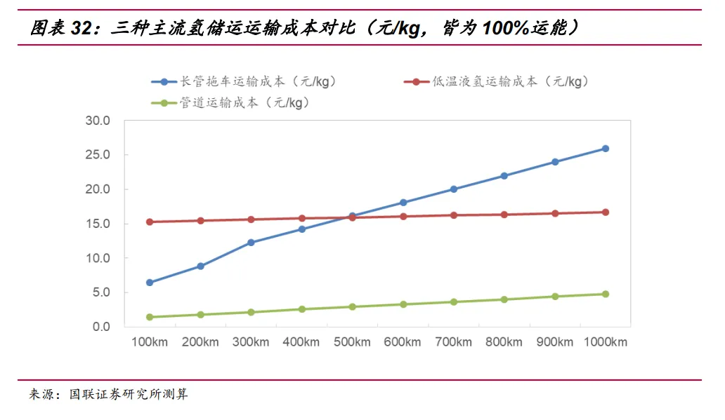 大规模输送下,管道输氢具备明显成本优势。根据以上假设,可测算出长度 25m、 年输送能力 10.04 万吨的氢气管道,运氢成本为 1.16 元/kg。由于压缩每公斤氢气所消耗的电量是相对固定的,管道运氢成本增长的驱动因素主要是与输送距离正相关的管材折旧及维护费用。当输送距离为 100km 时,运氢成本为 1.43 元/kg,同等运输距离下管道输氢成本远低于高压长管拖车及低温液态输氢。因此,当氢气下游需求足够支撑大规模的氢能输送,通过管道运输氢气是一种降低成本的可靠方法。