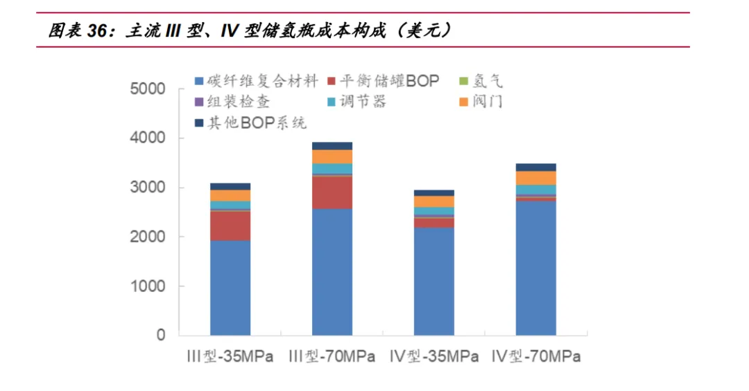 根据DOE及中科院宁波材料所测算,对于储氢质量均为5.6kg的35MPa、70MPa 高压储氢 III 型、IV 型瓶成本组成来看,主要成本贡献者是碳纤维复合材料,均占到总成本的 70%左右水平。此外,当 III 型及 IV 型瓶储氢压力增至 70MPa 时,碳纤维 复合材料应用成本及比例大幅提升。因此降低碳纤维应用成本是储氢瓶降本的关键。