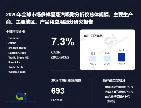 据调研,按收入计,2025年全球多样品蒸汽吸附分析仪收入大约422百万美元,预计2032年达到693百万美元,2026至2032期间,年复合增长率CAGR为7.3%。(数据来源:《2026年全球市场多样品蒸汽吸附分析仪总体规模、主要生产商、主要地区、产品和应用细分研究报告》 出版商:环洋市场咨询(Global Info Research))