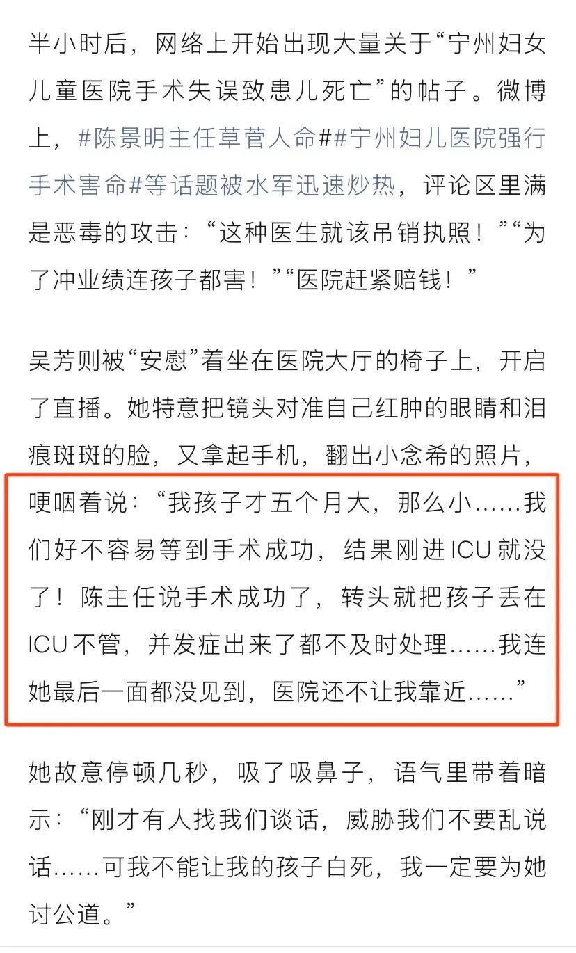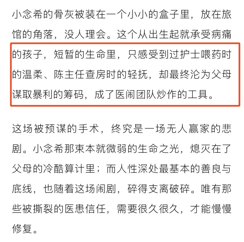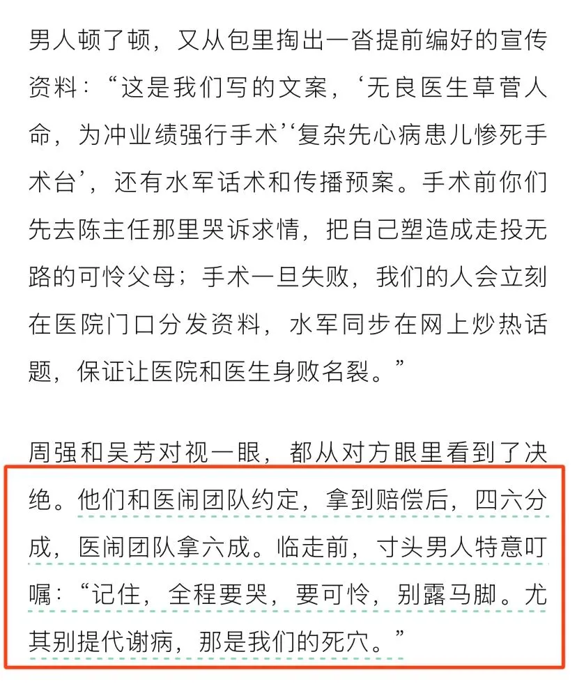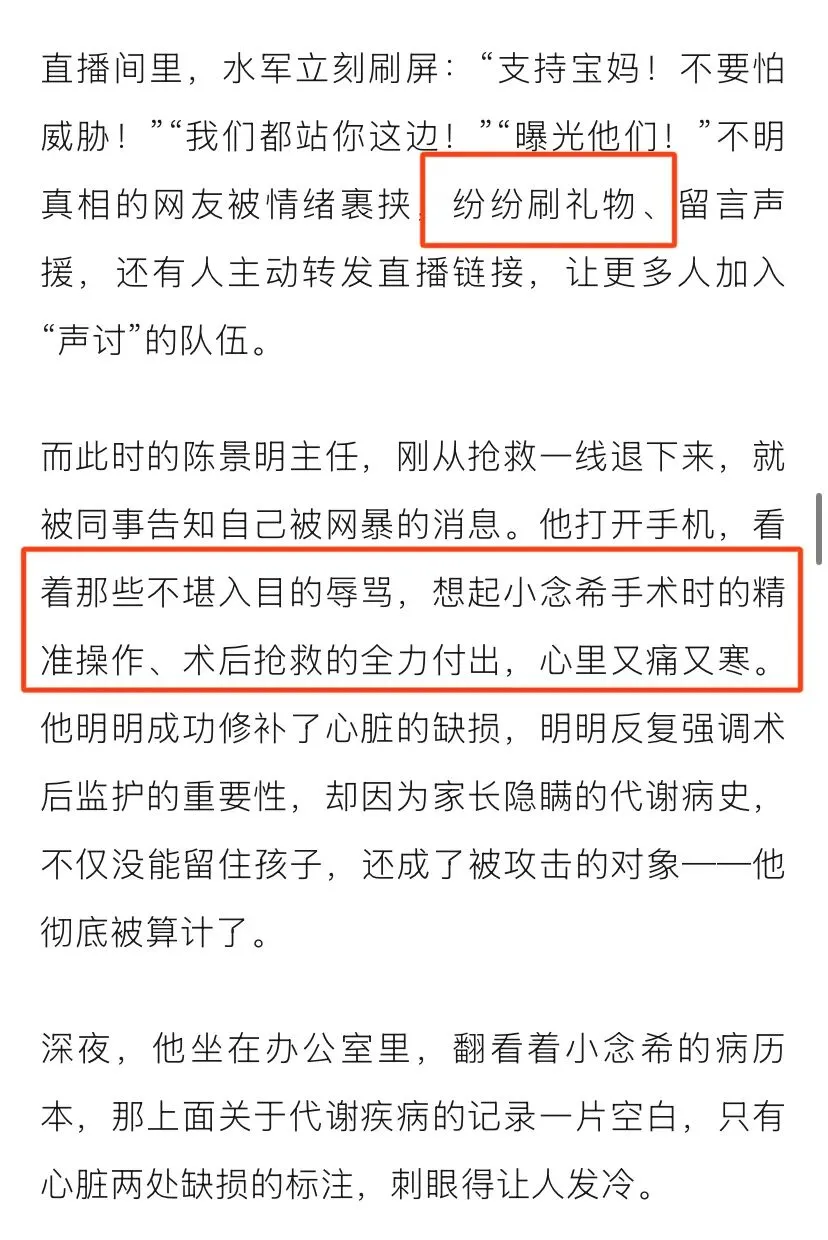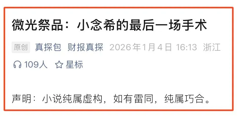2026年1月4日这个“财报真探”开始写小说了。还来个声明:小说纯属虚构,如有雷同,纯属巧合。不得不说,“财报真探”背后有高人啊。以下内容是对“财报真探”小说内容的分析,这小说写的有点意思,“财报真探”花心思了。在小说中,B超室确诊胎儿携带罕见基因缺陷...我想问一下“财报真探”,B超室还有这功能?在小说中,“财报真探”对细节的描述可谓是入木三分。是不是自己亲身经历哦?不然,这种细微的描述是如何想出来的?在小说中,“财报真探”对孩子的描述真的是非常详细。一个财经博主对医学问题如此精通,佩服佩服,真的是佩服,佩服的五体投地。我越来越发现,“财报真探”想象力那是真的丰富啊。说孩子去上海的顶级儿科医院,医生都摇头婉拒。言外之意,为夸奖宁州(小说中是宁州)儿科医术高超进行铺垫。在小说中,“财报真探”把孩子的父母写成了恶魔。“财报真探”从小是不是受过啥刺激?都说不幸的童年,需要一生来治愈。在小说中,“财报真探”把孩子父母恶魔形象进一步升级。佩服“财报真探”的想象力。在小说中,这个“财报真探”夸奖了宁州妇儿医院是一家口碑好、规模大,小儿心胸外科更是相当的专业啊。还不忘了把宁州妇儿医院的陈主任夸上一遍。“财报真探”就喜欢夸陈主任。在小说中,“财报真探”都把医闹的分成模式写出来了。看样,“财报真探”对水军这一行当还是有研究的?不然咋写的这么逼真?在小说中,“财报真探”详细写了孩子父母恳求陈主任医治孩子的情形。在小说中,“财报真探”多次夸奖陈主任,还有再一次通过细节黑化孩子父母。甚至写道孩子父母给陈主任送并不新鲜的糕点。在小说中,“财报真探”把孩子父母说成了演员,表演的天衣无缝。而通过细节把陈主任医者仁心的形象展现出来。这个“财报真探”真的是时时不忘夸奖陈主任。在小说中,“财报真探”真的是使出了浑身解数,对孩子父母妖魔化。通过对孩子父母细节的描述,例如;低头签字的瞬间,嘴角掠过一丝不易察觉的冷笑。在小说中,“财报真探”通过细节进一步夸奖陈主任。陈主任手术时小心翼翼,精细操作。在小说中,“财报真探”全力的在黑化孩子父母,夸奖陈主任。真是煞费苦心啊。在小说中,“财报真探”想方设法黑化孩子父母,想方设法夸奖陈主任。在小说中,“财报真探”都写到了孩子上了微博热搜。有点意思,这小说写的。在小说中,“财报真探”说孩子父母开直播,疯狂收礼物。把孩子父母妖魔化再升级。在小说中,“财报真探”真的是处处黑化孩子父母,甚至说父母只想尽快拿到赔偿。在小说里,“财报真探”在文章最后还不忘了夸奖陈主任。“财报真探”对陈主任情有独钟啊。下面这个截图是“财报真探”这篇小说截止我发文时打赏情况,打赏的很多人都看不见头像...不过,给“财报真探”打赏的人是越来越少了。万万没想到,“财报真探”不仅仅会写财经方面的内容,还会写医学专业内容,如今却又写起小说了。厉害厉害。不过,人在做,天在看。我还发现啊,无论是现实中还是在小说中,这个“财报真探”都不忘了夸奖陈主任...