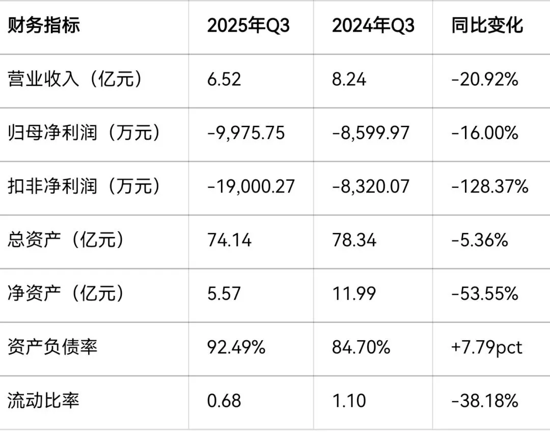 根据2025年三季报,公司财务状况极度恶化:总资产74.14亿元,负债68.57亿元,股东权益仅5.57亿元,资产负债率高达92.49%。2025年前三季度实现营业总收入6.52亿元,同比下降20.92%;归母净利润亏损9975.75万元,扣非净利润亏损1.9亿元,亏损幅度进一步扩大 。