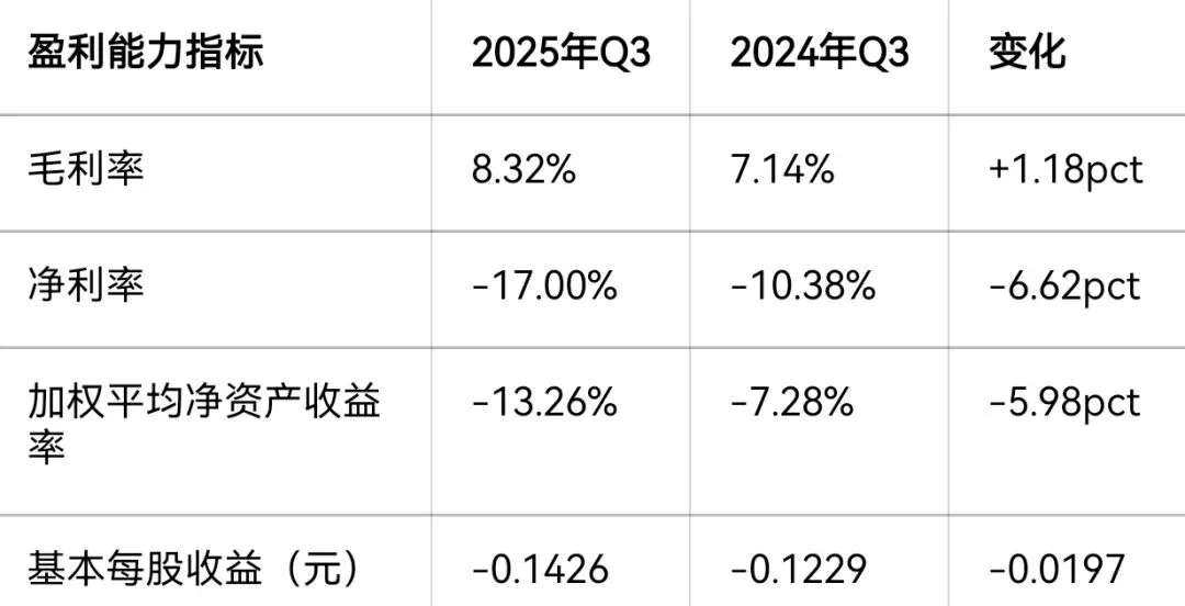 亏损进一步扩大:归母净利润亏损9975.75万元,同比亏损增加16%;扣非净利润亏损1.9亿元,同比扩大128.37%,表明主营业务盈利能力持续恶化。值得注意的是,一季度曾实现盈利1457万元,但二、三季度连续亏损,反映出经营压力的持续性。