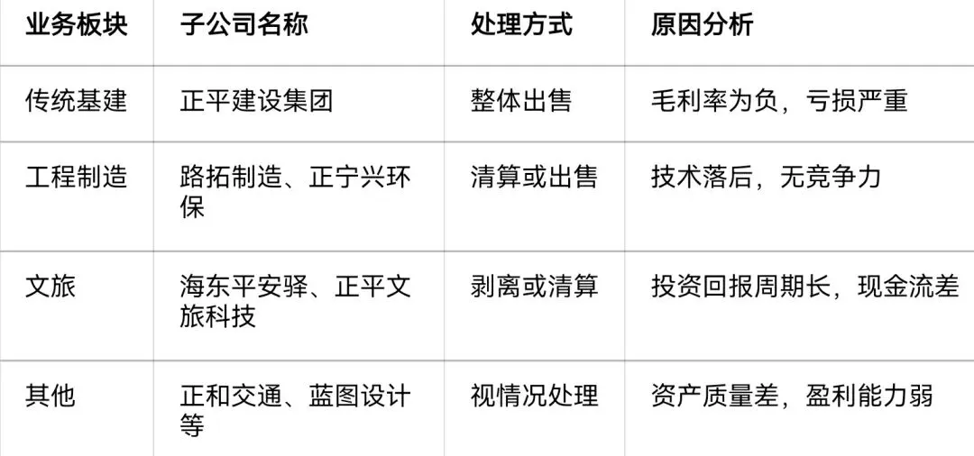 - 剥离或清算:传统基建、工程制造、文旅等低效业务板块