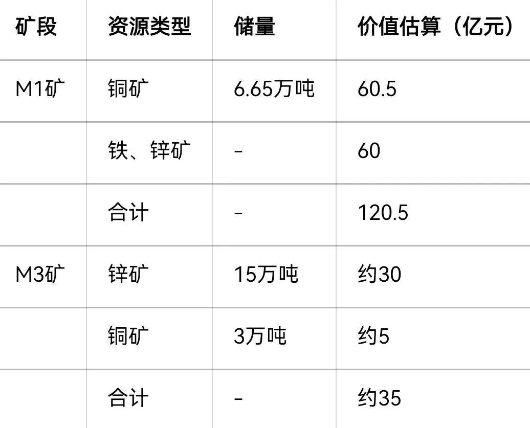 M3矿段勘探进展:M3矿段面积约9.08平方公里,是M1矿段的10倍,已完成普查工作,探矿权已升级为详查探矿权 。已探明铜金属量约3万吨(品位1.13%-2%)、锌金属量约15万吨(平均品位5.2%,高品位),伴生银矿及硫矿尚未详细测算 。