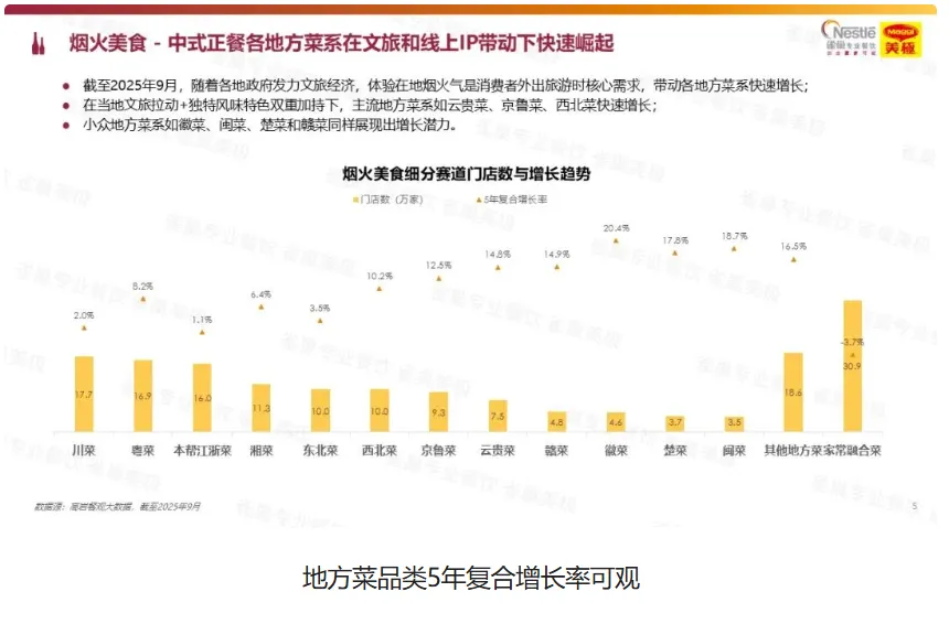 “烟火”的第一层内涵,是地风道物。伴随文旅消费的兴起,地方菜成为中式正餐增长的核心亮点,从小众赛道走向大众视野。