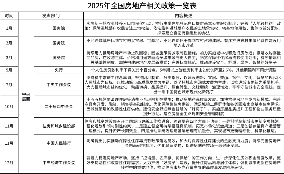 政策延续宽松态势,需求端刺激与供给端优化并行:一方面通过购房补贴、利率下调、商品房以旧换新等工具直接提振市场信心;另一方面通过容积率规则调整、住宅设计细则升级、土地新规等政策,推动住房供给从“量”向“质”转型。