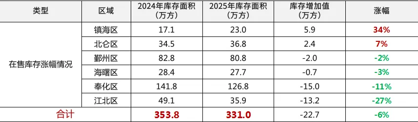 ②区域存量变化:江北区库存面积下降明显,主要由于在售库存少;鄞州区库存同比减少2%,保持稳定,其余区域库存均有不同程度下降。