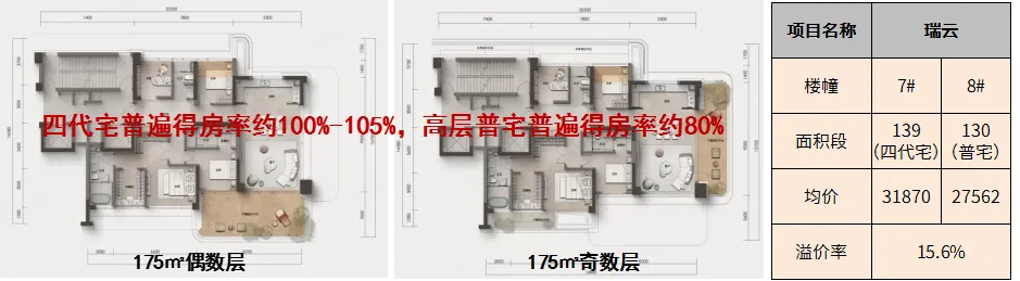 今年为宁波四代宅元年,目前宁波已有10个四代宅项目,其中3个在售,7个待售,普遍面积139㎡起档,四代宅普遍得房率约100%-105%,远超普宅的80%-85%,根据建发瑞云四代宅与普宅的价差,四代宅相比普宅溢价率约15%左右。