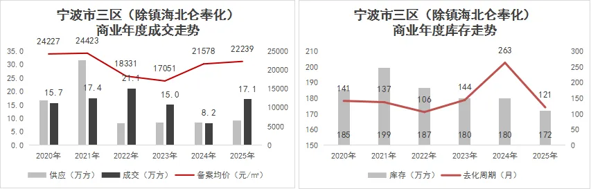 2025年宁波市六区整体库存量有所下行,潜在待推量321万方,受今年成交下探影响整体动态去化周期有所拉长;北仑核心地段基本无项目在售,外围项目去化缓慢库存仍居高位,动态去化周期74.9个月;奉化广义库存270万方,库存高位承压去化周期111个月;鄞州为成交主力区域,整体库存可控,动态去化周期最低仅需23个月去清完毕。