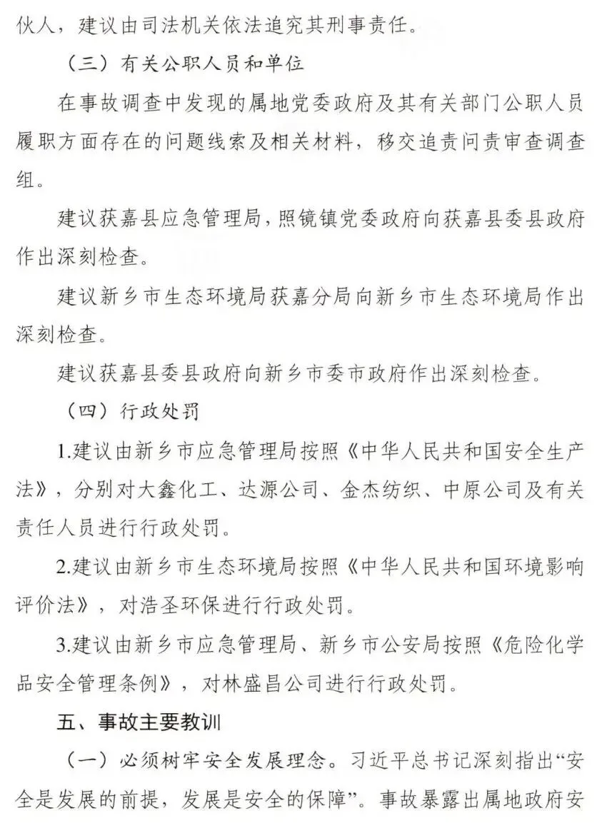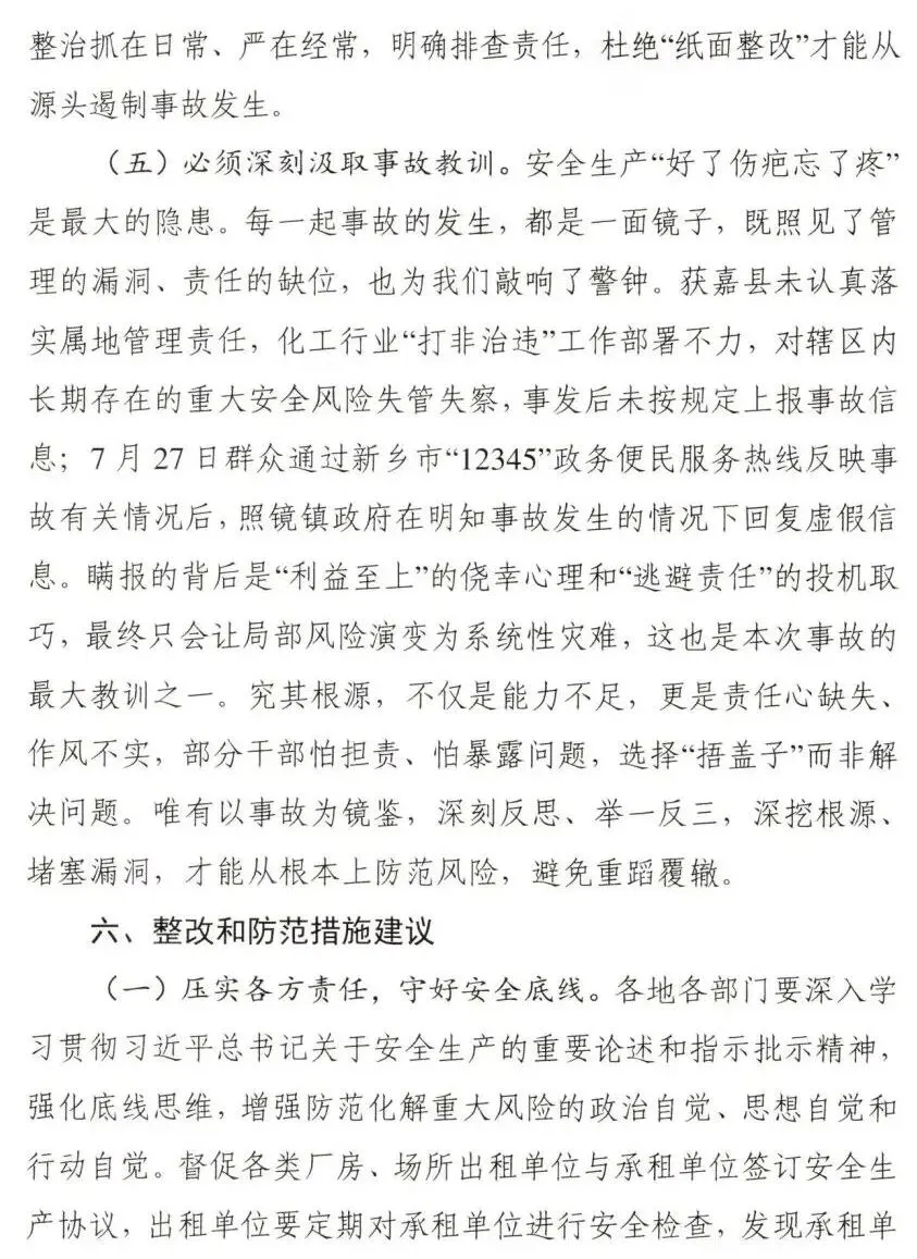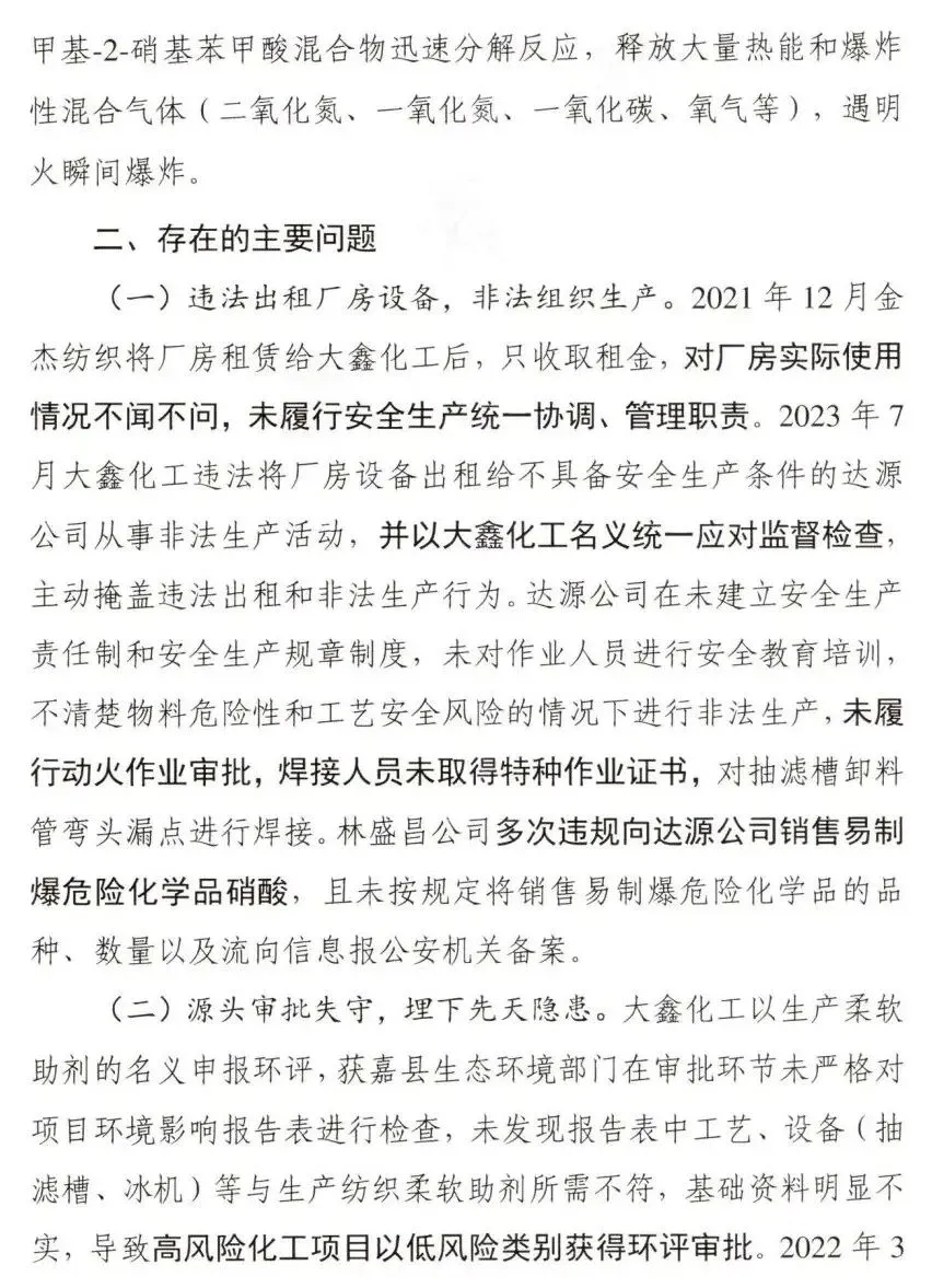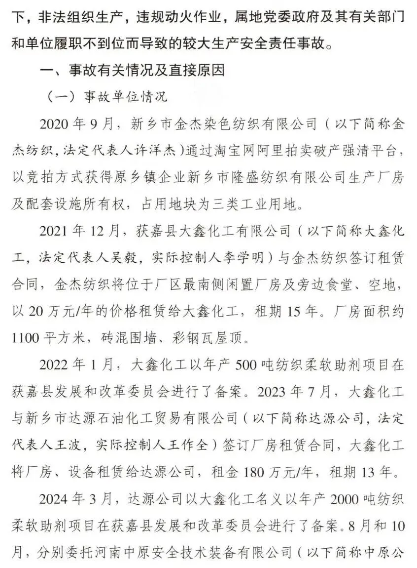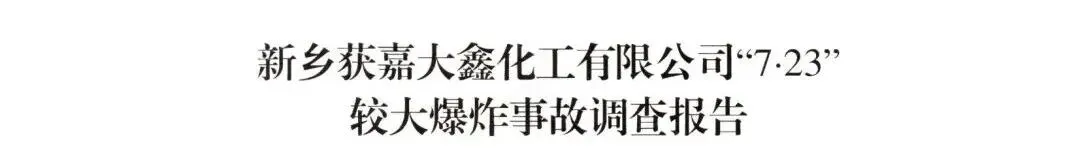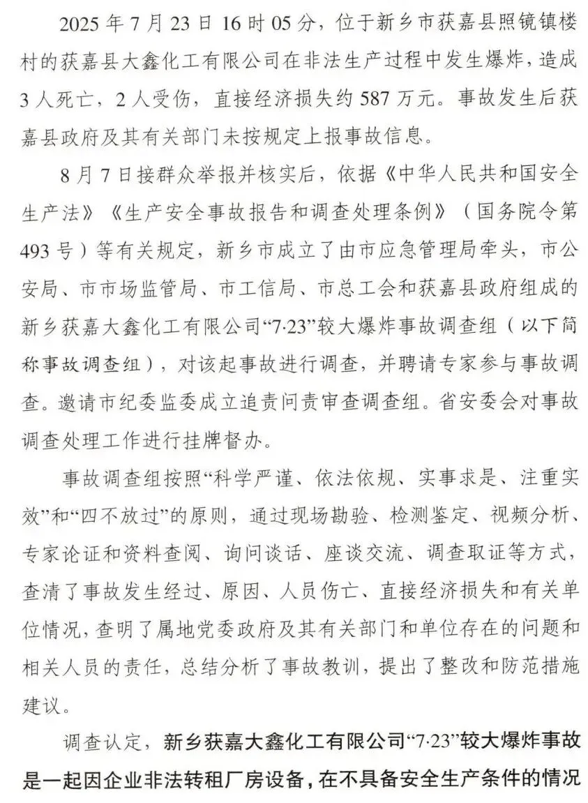 调查认定,新乡获嘉大鑫化工有限公司“7·23”较大爆炸事故是一起因企业非法转租厂房设备,在不具备安全生产条件的情况下,非法组织生产,违规动火作业,属地党委政府及其有关部门和单位履职不到位而导致的较大生产安全责任事故。