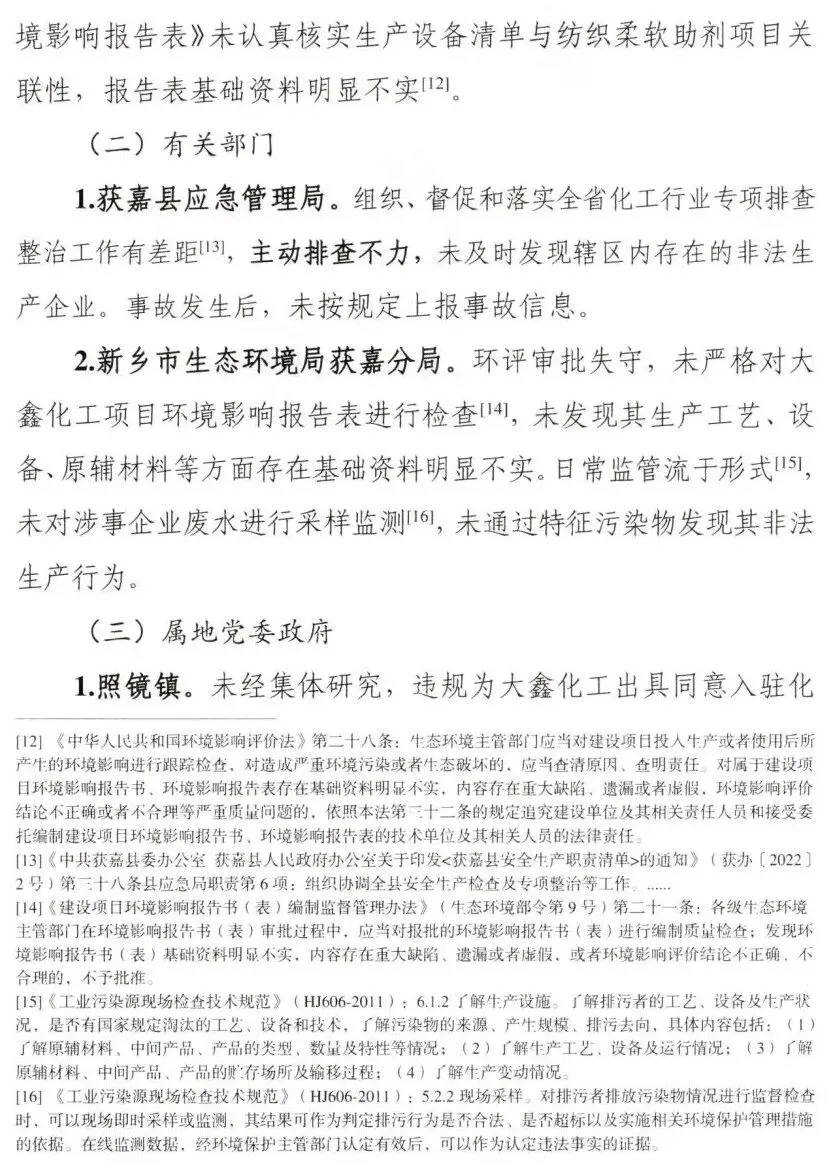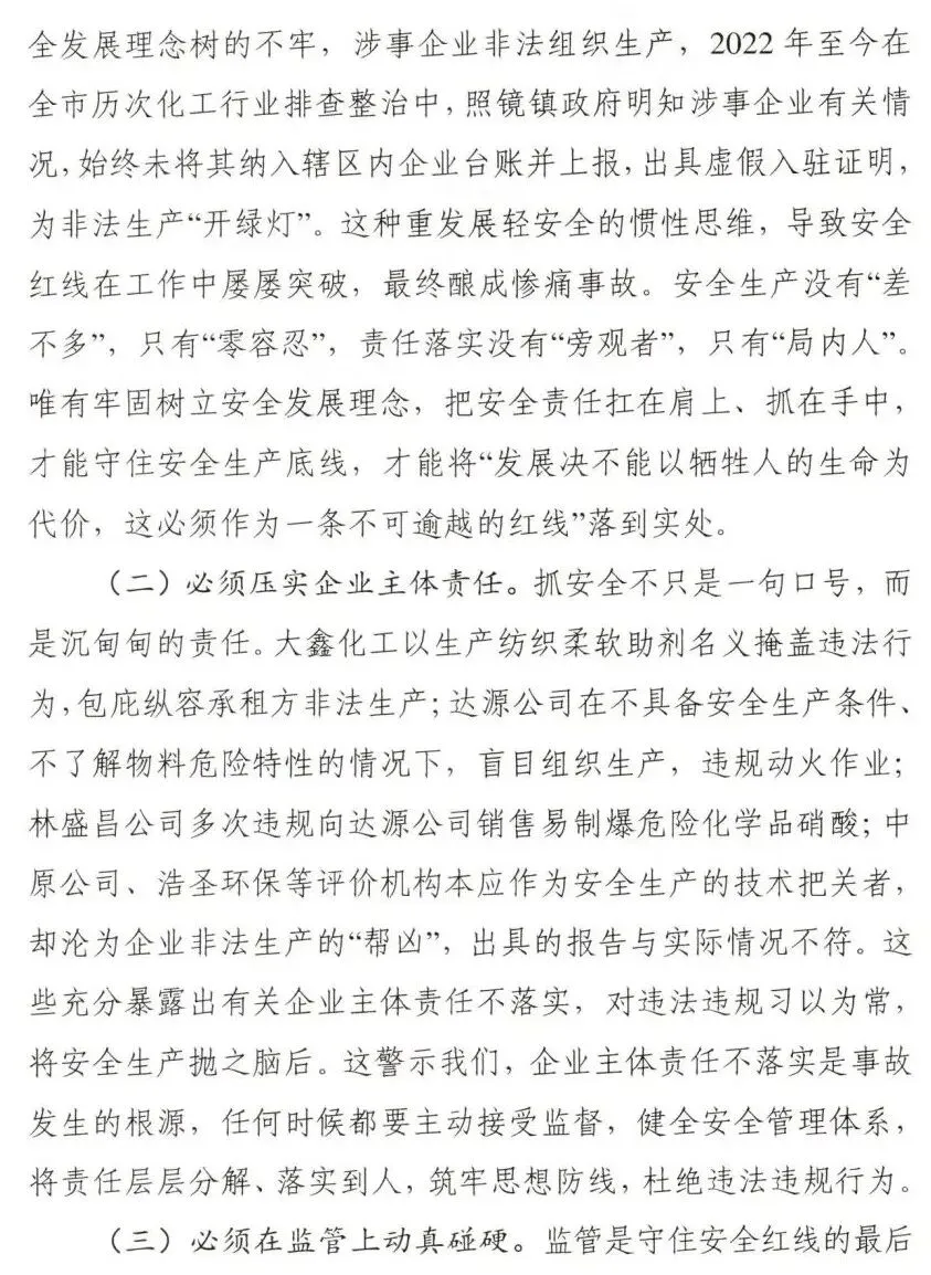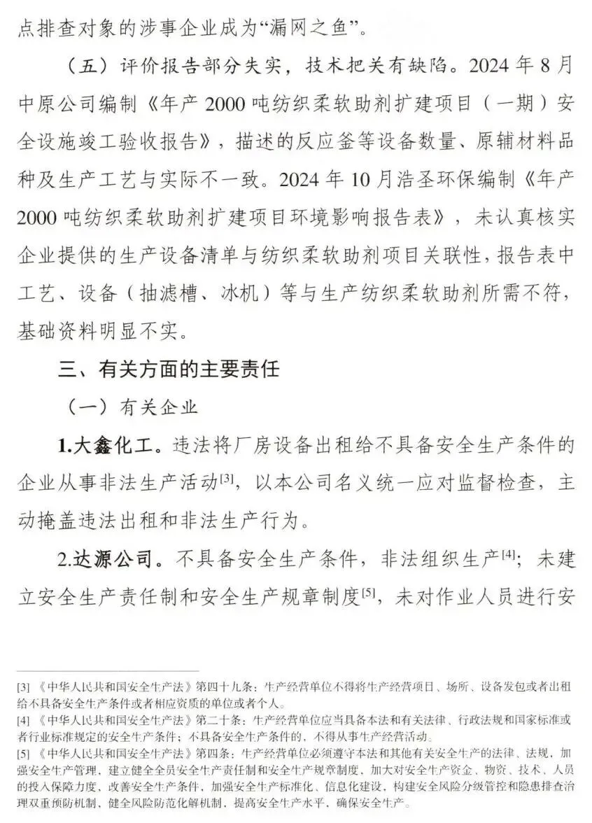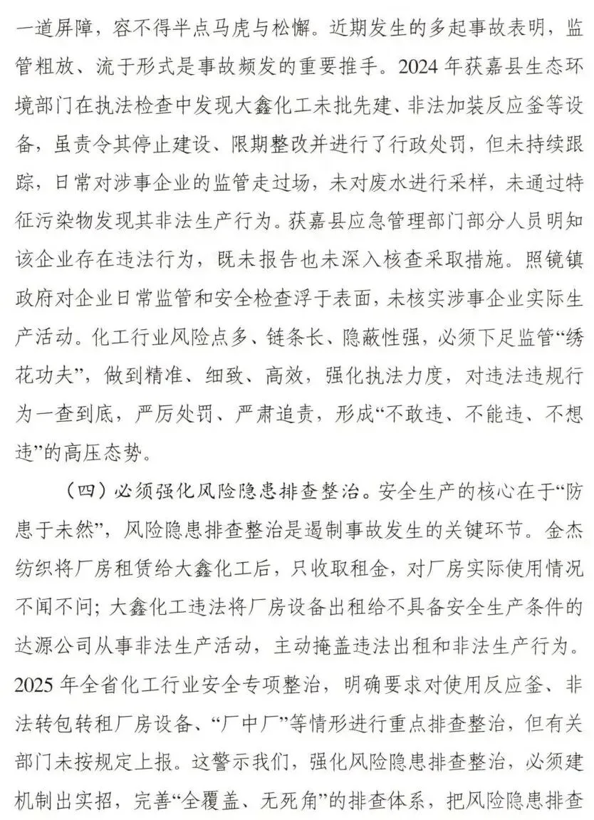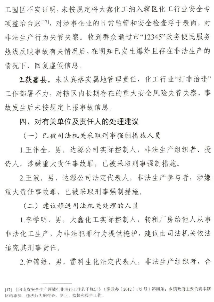 调查认定,新乡获嘉大鑫化工有限公司“7·23”较大爆炸事故是一起因企业非法转租厂房设备,在不具备安全生产条件的情况下,非法组织生产,违规动火作业,属地党委政府及其有关部门和单位履职不到位而导致的较大生产安全责任事故。