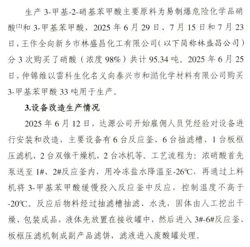 2. 沉积物料高爆炸危险性。3-甲基-2-硝基苯甲酸含有硝基等爆炸性基团,属易燃易爆固体,分解温度较低,受热(焊接高温)条件下,在密闭空间内分解反应可迅速转变为爆轰。硝酸是强氧化性液体,在高温环境下遇3-甲基-2-硝基苯甲酸可增强分解反应。