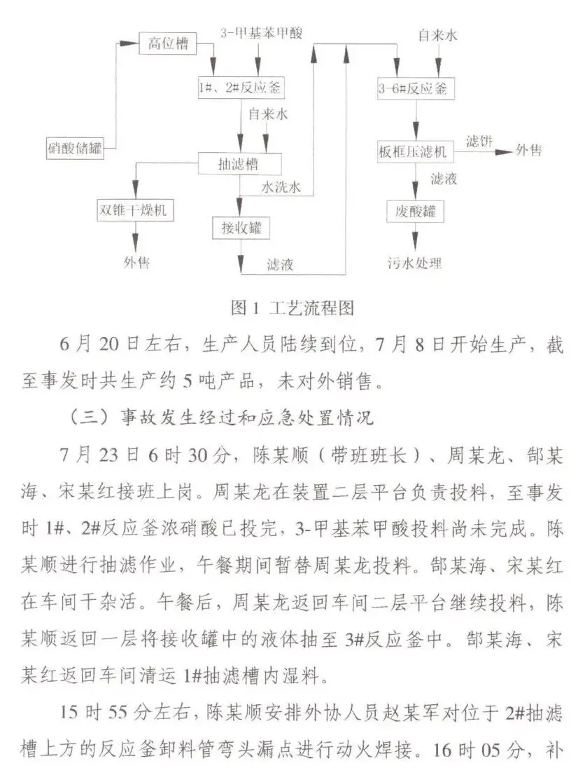 二:直接原因 反应釜卸料管无倾斜度,物料在卸料管内沉积,在未冲洗、置换和采取有效隔离措施的情况下,违规对卸料管弯头漏点进行动火焊接,电焊产生的高温导致硝酸和3-甲基-2-硝基苯甲酸混合物迅速分解,释放大量热能和爆炸性混合气体,遇明火瞬间爆炸,造成人员伤亡。