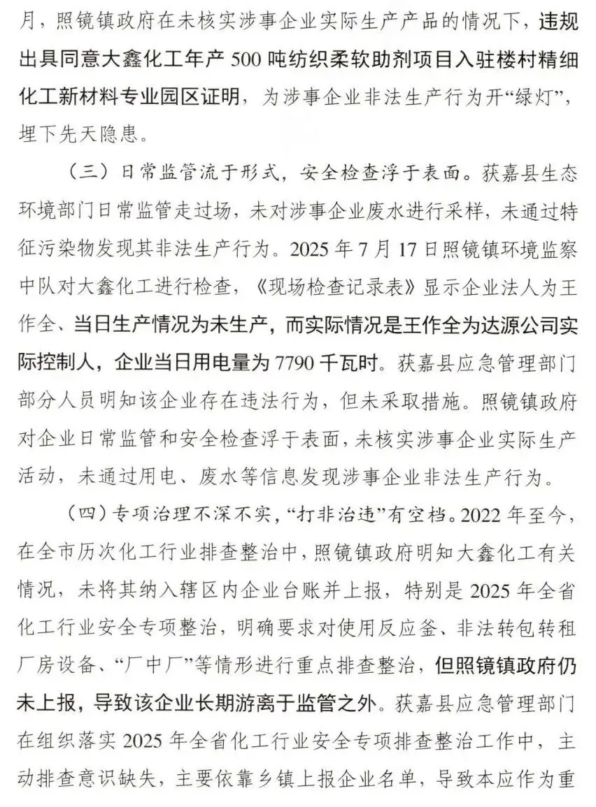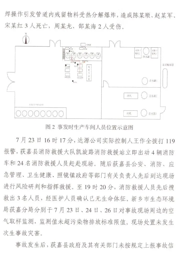 一:事故概述 2025年7月23日16时05分,位于新乡市获嘉县照镜镇楼村的获嘉县大鑫化工有限公司在非法生产过程中发生爆炸,造成3人死亡,2人受伤,直接经济损失约587万元。事故发生后获嘉县政府及其有关部门未按规定上报事故信息。