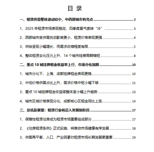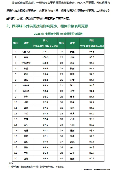 城市表现差异显著:仅乌鲁木齐、贵阳、呼和浩特 3 城租金同比上涨,乌鲁木齐涨幅 4.1%;西部城市抗波动能力更强,上海、成都租金表现相对稳健,部分城市下半年显现止跌回升迹象。 价格中枢下移:重点 10 城中低价位房源供需占比上升,一线城市 2000 元 / 套 / 月以下房源需求占比达 41.2%,二线城市该区间供需占比超 68%,中高价位需求占比小幅下降。 区域分化明显:一线城市核心区租金跌幅更突出,远郊区相对抗跌;成都核心区逆势上涨,锦江、青羊等区域租金同比涨幅超 2%,二线城市远郊区域受需求下降影响更显著。