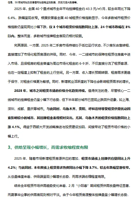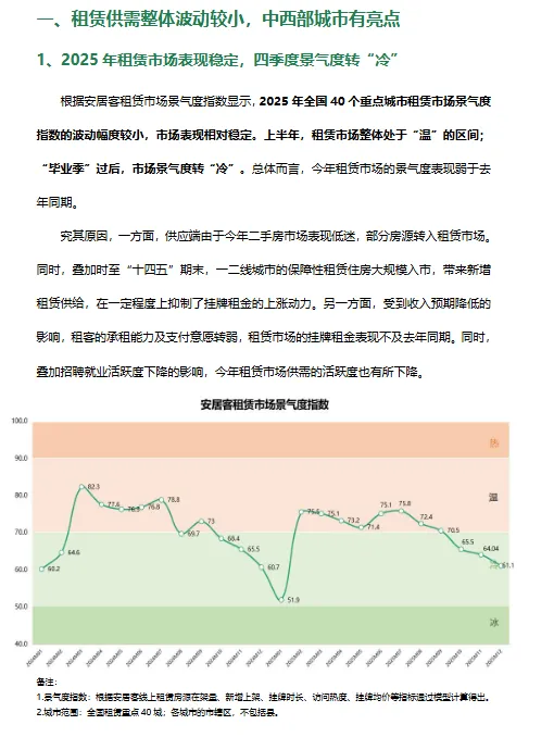 景气度波动收窄:上半年市场维持 “温” 度区间,毕业季后转 “冷”,全年景气度弱于去年同期,核心因二手房源转租赁、保障房入市增加供给,叠加收入预期转弱抑制需求。 供需结构微调:全国 40 城线上挂牌供应同比增长 4.2%,29 城供应增加;需求热度同比下降 3.7%,但跌幅显著收窄,13 城需求同比增长,重庆、南京增幅超 15%。 去化压力分化:平均挂牌周期延长至 41.9 天,仅 14 城去化加快,东莞、武汉、广州挂牌周期降幅超 5 天;北京、上海因租金偏高、需求转弱,出租难度加大。