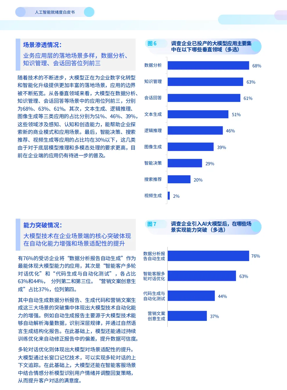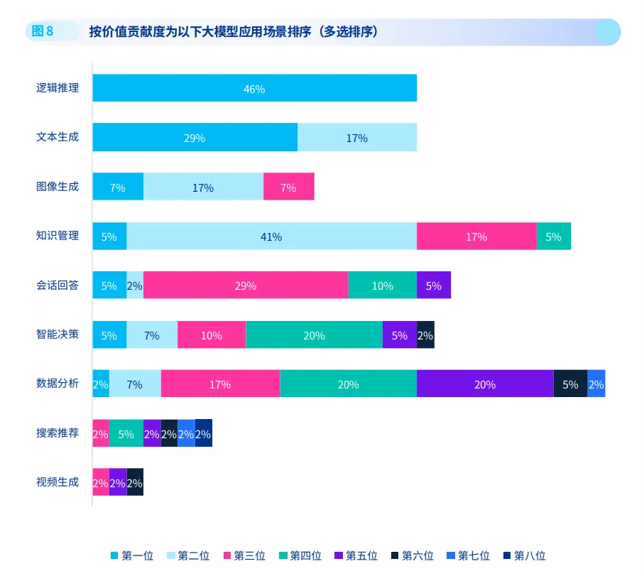 调研结论显示,企业的战略认知普遍认为基础设施建设是核心,硬件实力优先于软实力。在就绪程度上,绝大多数受访企业的AI Ready程序仍需要追赶行业平均水平。受访企业的业务应用场景众多,数据分析、知识管理、会话问答位列前三。价值收益上,逻辑推理、文本生成、图像生成和知识管理等大模型应用对企业价值贡献度最大。