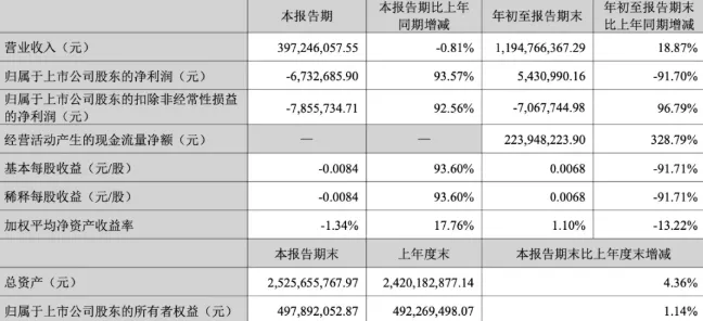 问题主要出在第三季度。单单看7月到9月这三个月,公司营收是3.97亿元,比去年同期微降了0.81%。更要命的是净利润,这一季度直接亏损了673.27万元。看来第三季度的经营压力不小,直接把前三季度好不容易攒下的一点利润给吃掉了一大块,导致整体利润数据非常不好看。