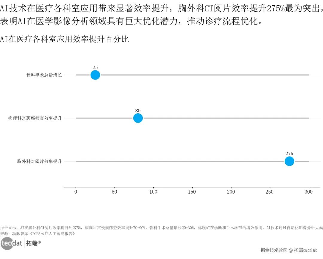 AI医疗应用效率提升刻度线图表1AI医疗应用效率提升刻度线图表1数据EXCEL及图表PDF模板已分享到会员群3秒解读:AI在医学影像分析和手术辅助领域价值最突出,胸外科CT阅片效率提升幅度最大,成为临床赋能的核心场景。行动建议:医疗机构管理者可结合“智慧医院建设”政策导向,优先在影像科、骨科等高频需求科室布局AI工具,快速释放人力产能;创业者可聚焦细分科室未被覆盖的需求,开发垂直场景解决方案,强化医工结合,契合产业升级趋势。