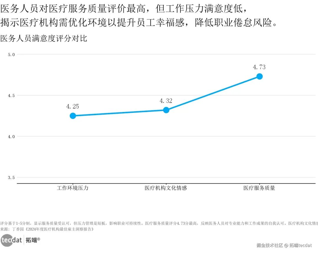 医务人员对医疗服务质量的满意度评分最高(4.73分),对医疗机构文化情感(4.32分)和工作环境压力(4.25分)的满意度相对较低。1-5分制的评分结果显示,医疗服务质量获得行业认可,但工作压力管理成为突出短板,这一问题直接影响医务人员职业可持续性,与“改善医务人员执业环境”的政策导向密切相关。