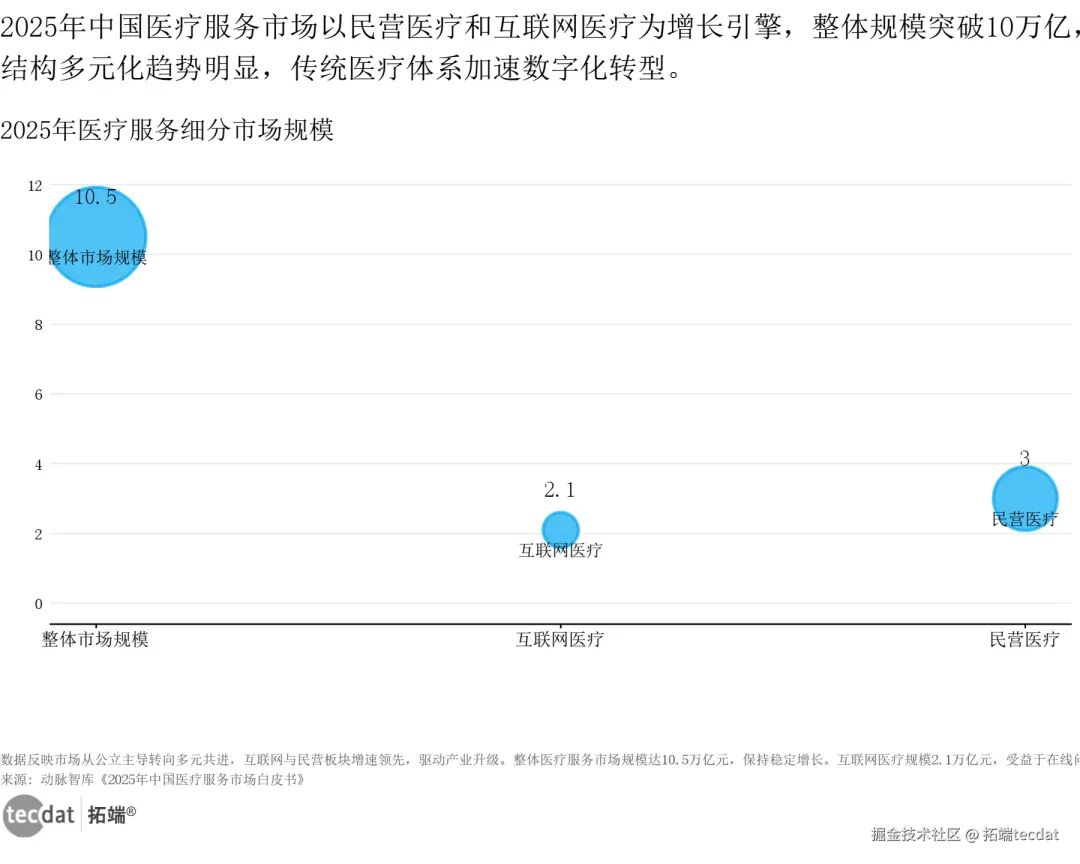 2025年医疗服务细分市场规模气泡图表92025年医疗服务细分市场规模气泡图表9数据EXCEL及图表PDF模板已分享到会员群3秒解读:中国医疗服务市场规模庞大,民营医疗和互联网医疗增速领先,市场结构持续优化。行动建议:投资者可关注民营专科医疗和互联网医疗平台的投资机会,契合产业多元化发展趋势;公立医疗机构可借鉴民营机构的服务模式,提升运营效率,构建协同发展生态。