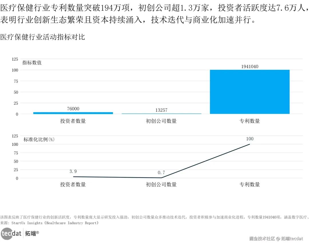 医疗保健行业创新生态持续繁荣,专利数量突破194万项,初创公司超1.3万家,投资者活跃度达7.6万人。庞大的专利数量体现研发投入强劲,初创公司推动技术迭代,投资者加速商业化进程,三者形成良性循环,契合“创新驱动发展”的政策导向,为行业高质量发展提供核心动力。