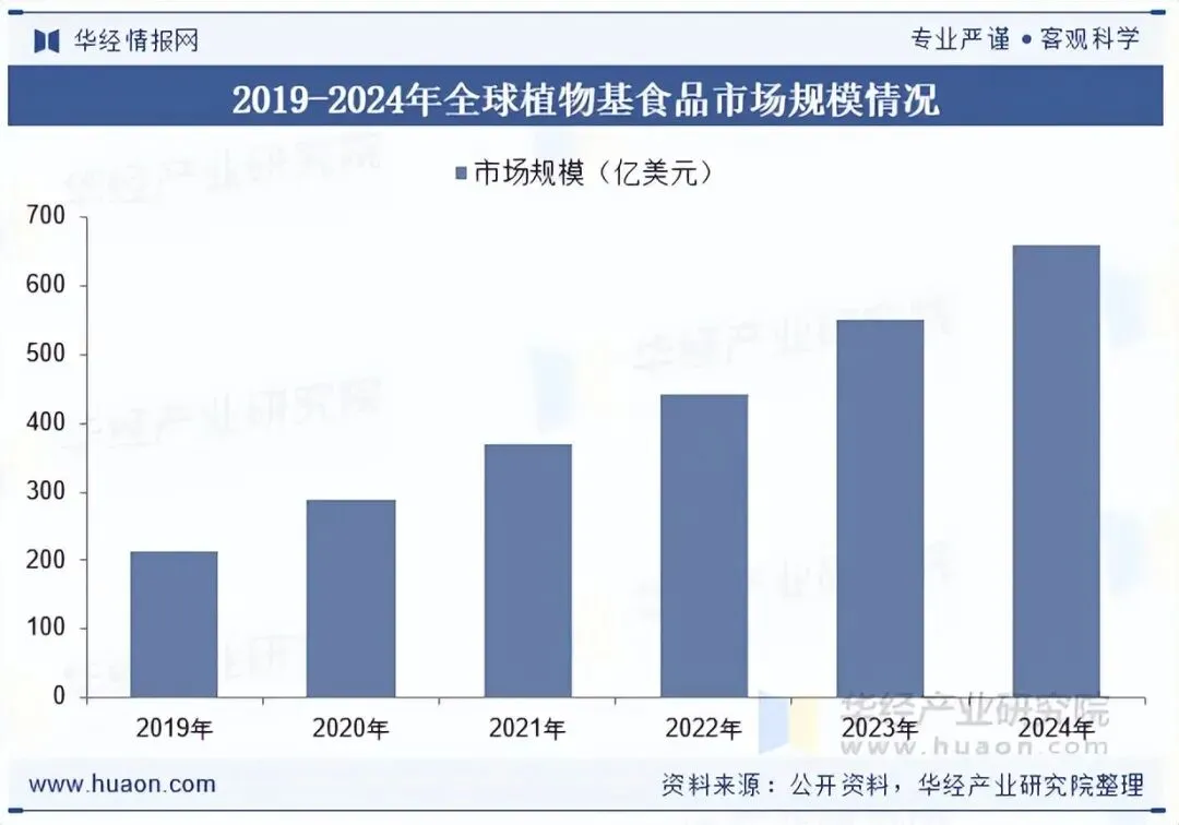 随着素食文化的持续深入,素食市场的未来潜力逐步显现,已成为食品行业的重要增长板块,推动着健康与可持续发展的新潮流。对于食品品牌和生产商而言,素食市场不仅是创新与转型的机遇,更促使其重新聚焦于消费者需求。近年来,植物基食品市场规模和价值持续攀升。据统计2024年全球植物基食品市场规模约为659亿美元,2019-2024年CAGR约为25.23%。