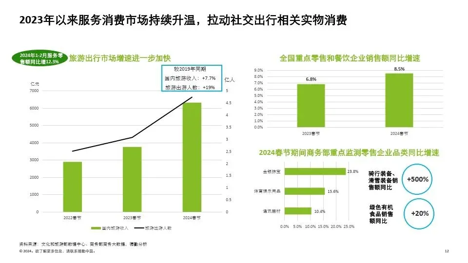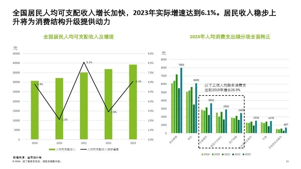 2023年全国居民收入实际增速达到6.1%,较2022年 提升3.2个百分点。同时,居民对舒适型消费支出持 续提升。