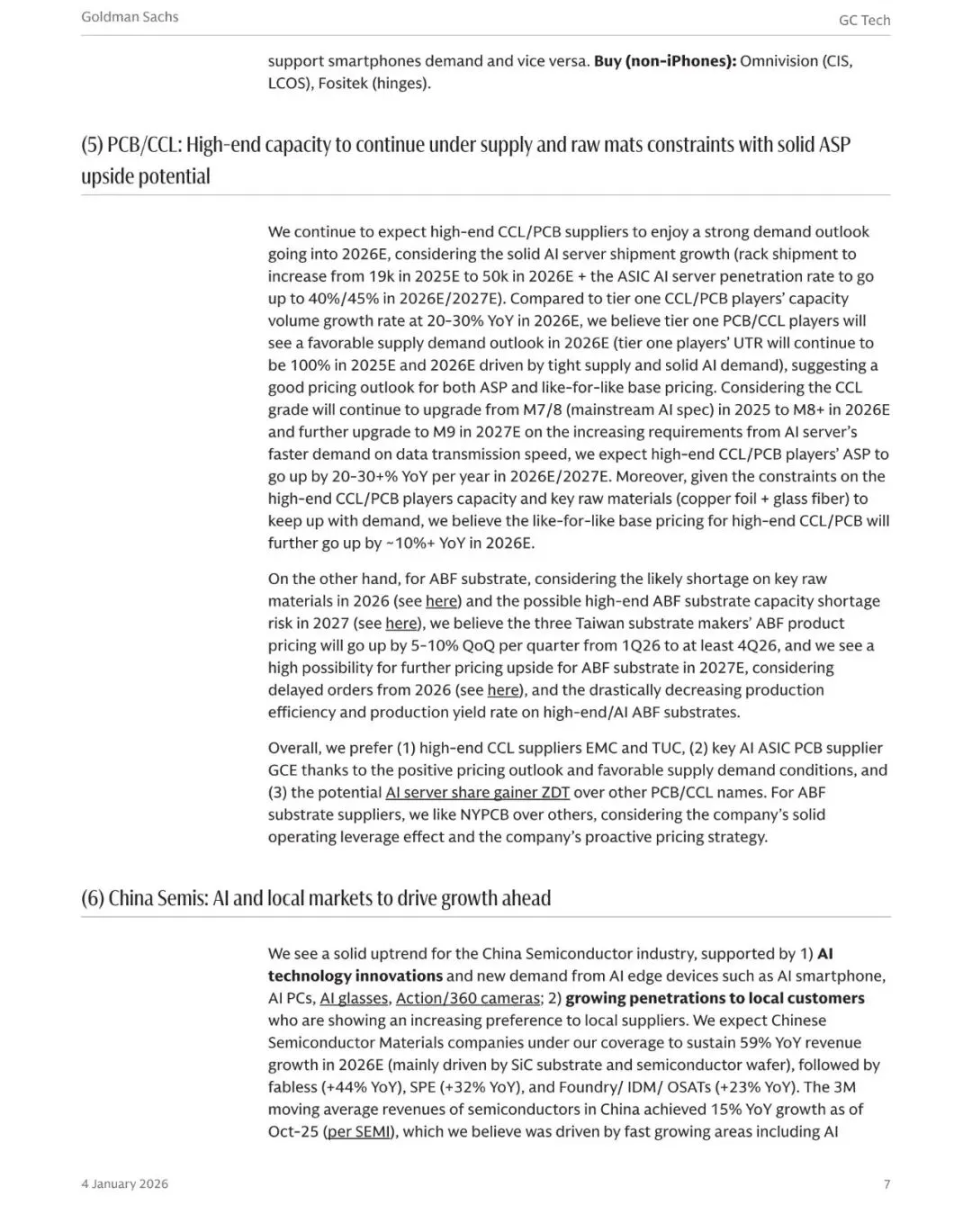 2026年,高端CCL(覆铜板)和PCB(印制电路板)市场将继续面临供需紧张的局面。随着AI服务器出货量的增长和ASIC芯片渗透率的提升,高端PCB/CCL的需求将保持强劲。预计2026年和2027年,高端CCL/PCB供应商的ASP(平均售价)将同比增长20%-30%。同时,原材料供应的限制也将进一步推高产品价格。