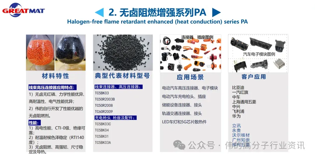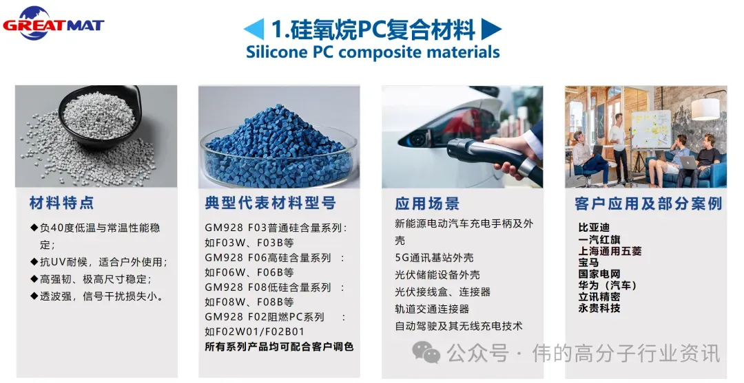 免责声明:我们转载此文出于传播更多资讯之目的,本文所用的视频、图片、文字如涉及作品版权问题,请第一时间联系小编删除,谢谢!作为业内知名的高分子复合材料技术方案提供商,广东伟的新材料股份有限公司是您最佳的合作伙伴!伟的新材根据中下游客户的实际应用需求,同时着力“核心助剂、复合改性及产业应用研究”三个环节,为客户提供可靠的材料解决方案,助力产业供应链自主化进阶!公司主营核心产品:硅氧烷PC及其复合材料、无卤阻燃增强(导热)PA等一系列高性能复合材料,已广泛应用于新能源汽车、储能、光伏、通信、军工、轨道交通、航空航天、智能LED照明等领域。
