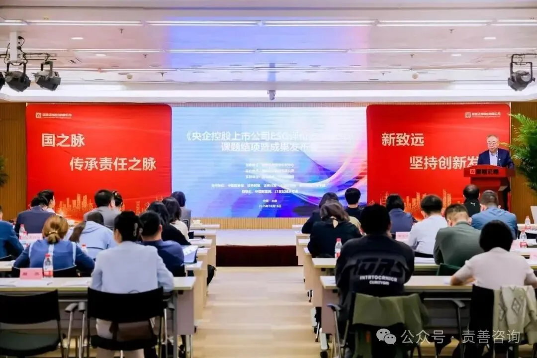 2025 年 10 月,由国务院国资委研究中心指导、国新证券股份有限公司承办的《央企控股上市公司 ESG 评价体系研究》课题发布会在北京举行。作为国内聚焦央企 ESG 领域的权威会议,此次发布会汇聚了监管机构(国务院国资委、证监会)、央企代表(国家电网、中国石油、中国建筑等)、金融机构及第三方 ESG 服务机构,发布的研究成果不仅首次系统呈现央企 ESG 披露全貌,更通过 “案例分享 + 数据验证” 的形式,为行业提供了可复制的实践经验,为推动央企 ESG 从 “量的覆盖” 向 “质的提升” 注入新动力。