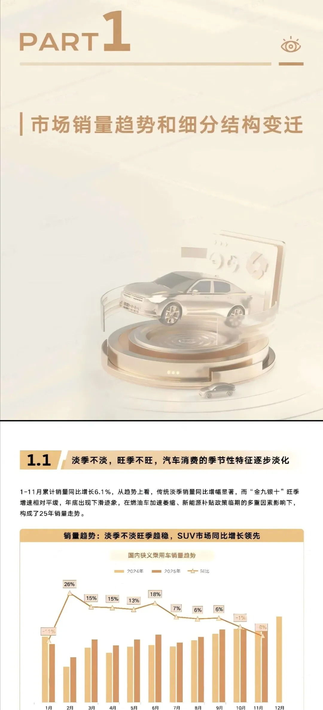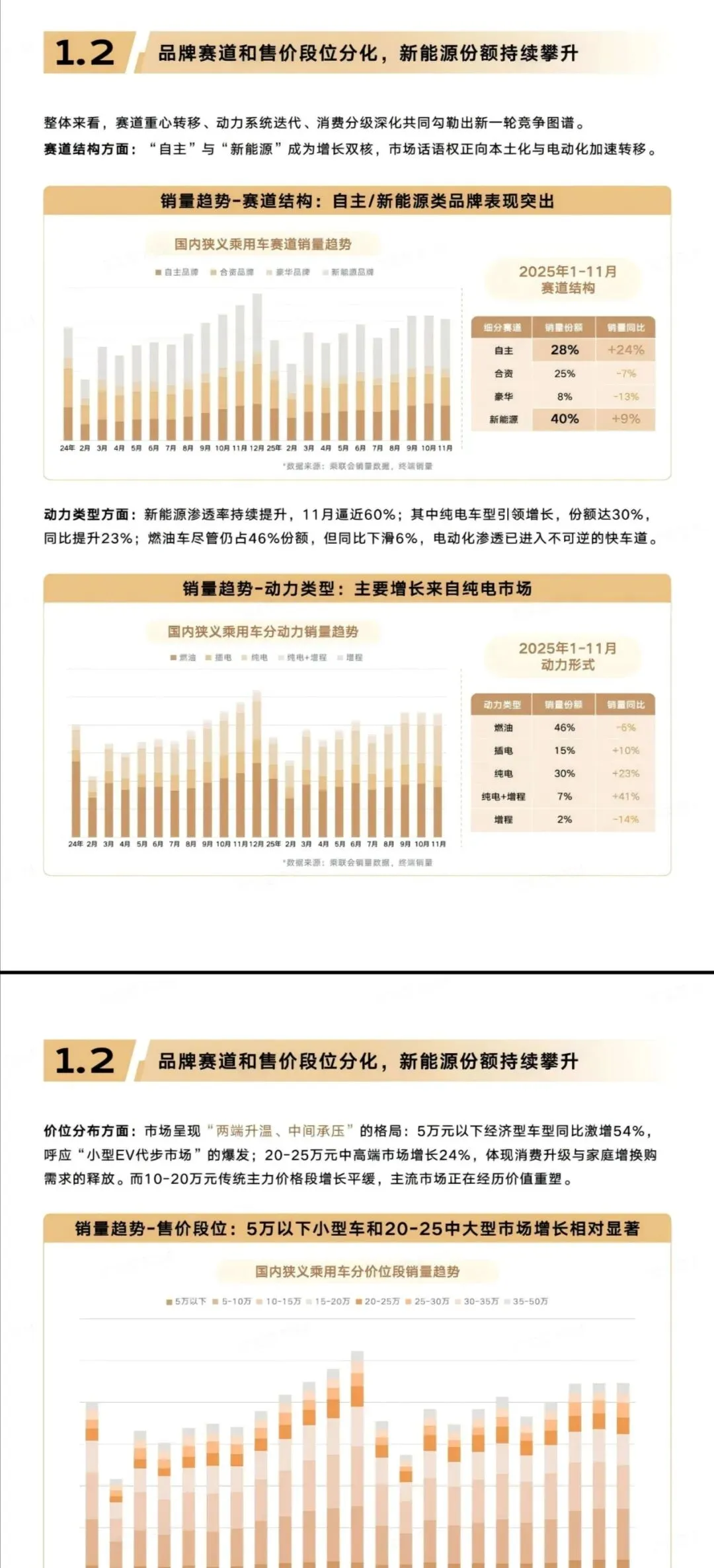 2025年中国乘用车市场正经历“结构分化、增量提质”的深刻变革。核心数据显示,1-11月销量同比增长6.1%,新能源渗透率逼近60%,自主品牌份额达28%,增长24%,成为驱动市场的主引擎。市场季节性特征淡化,消费分级加剧:5万元以下小型EV市场同比激增54%,印证代步需求爆发;20-25万元中高端市场增长24%,凸显家庭增换购升级。电动化已进入不可逆的快车道,纯电份额提升至30%。