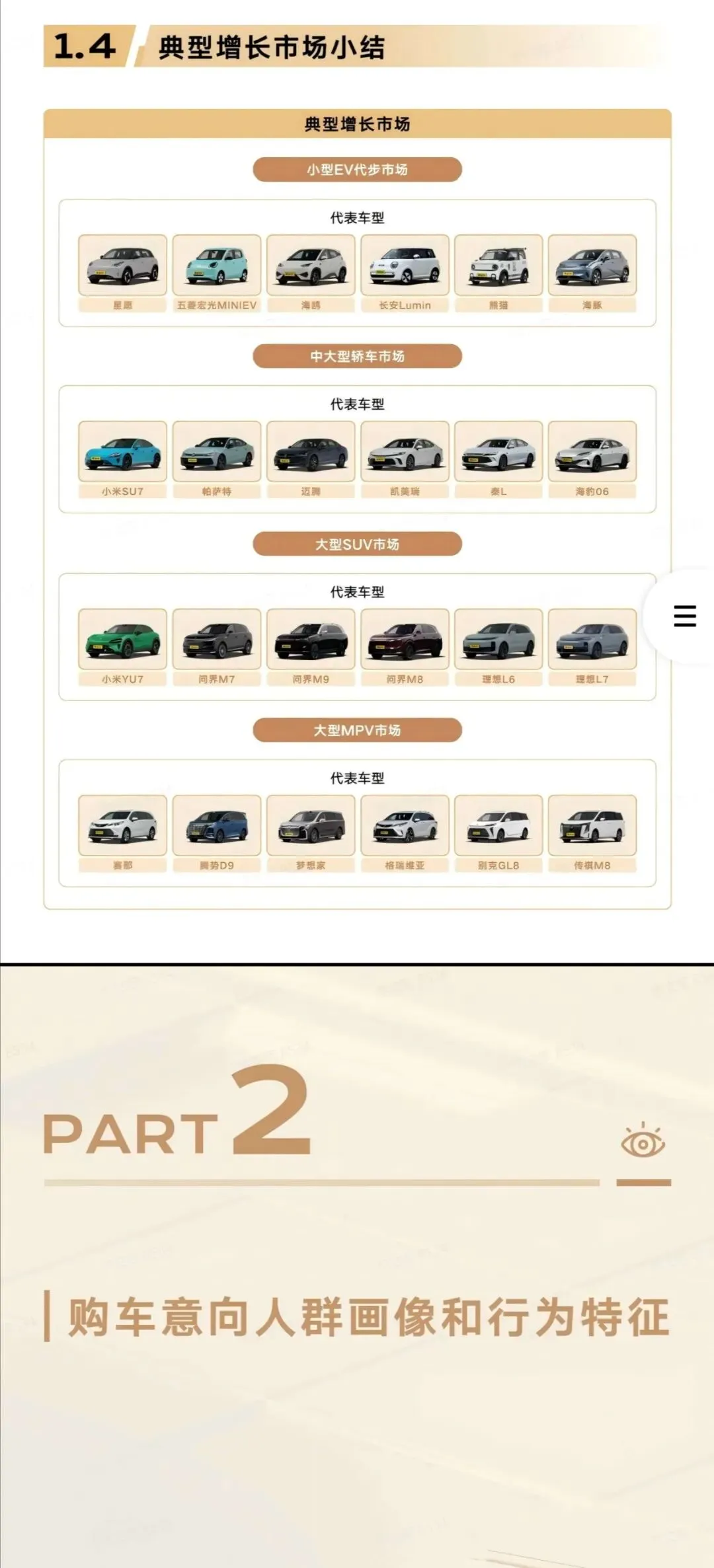 产品规划需紧扣细分市场:小型EV强调功能性设计,中大型轿车追求调性科技,大型SUV/MPV侧重场景体验。启示明确:品牌需通过真实场景内容建立信任,从“大众化产品”转向“专属场景溢价”,才能在存量竞争中破局。