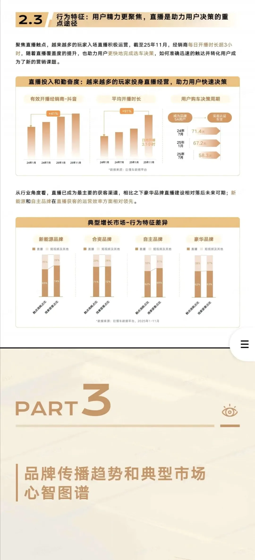 用户行为呈现“她经济化”、年轻家庭化特征,直播成为决策关键触点——经销商日均开播超3小时,新能源品牌借此高效转化用户。品牌传播从“参数竞争”转向“场景驱动”,智能驾驶、用车场景心智排名飙升,安全与科技成为核心购买驱动力。