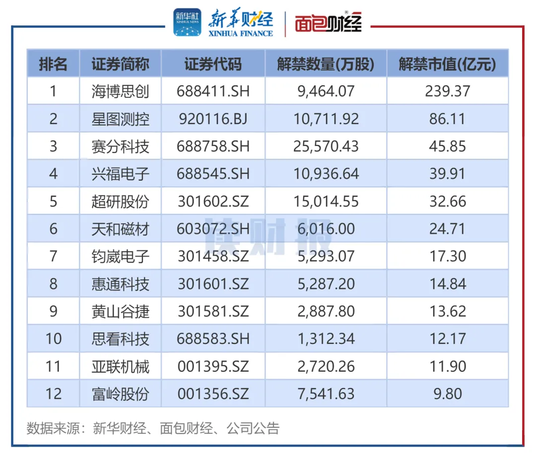 此外,共有12家公司、10.28亿限售股于1月迎上市周年解禁,解禁市值为548.24亿元,包括海博思创、星图测控、赛分科技等企业。