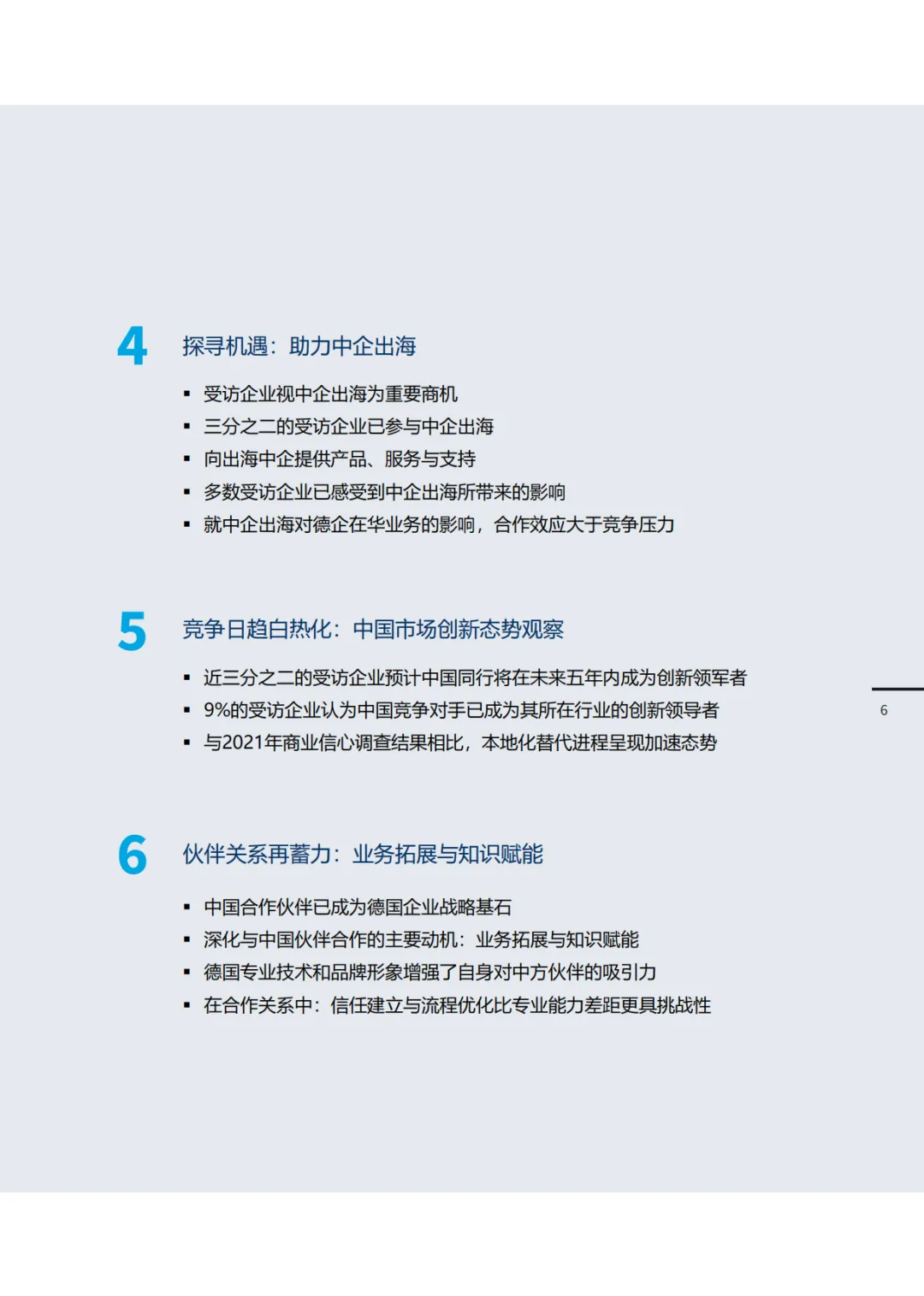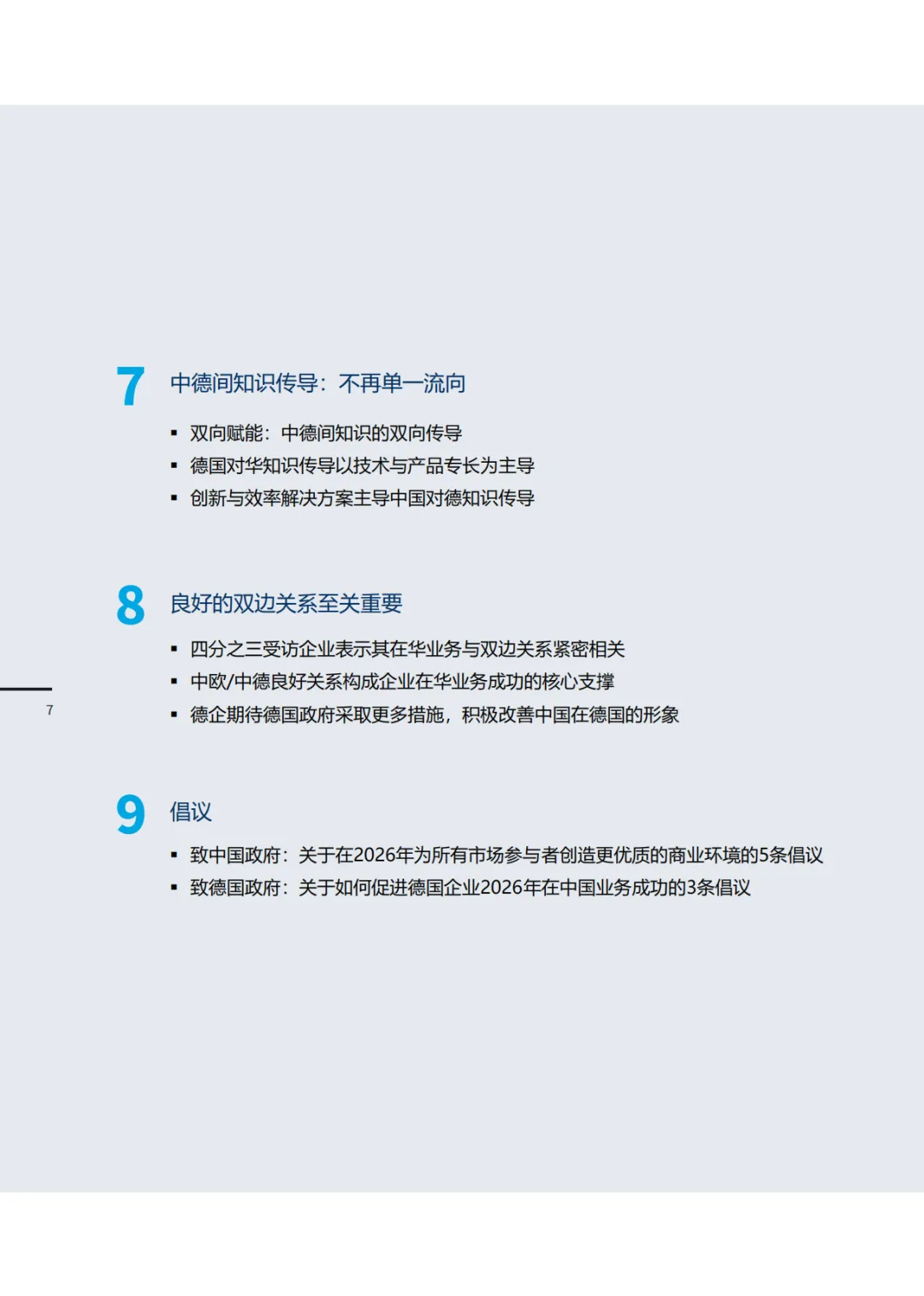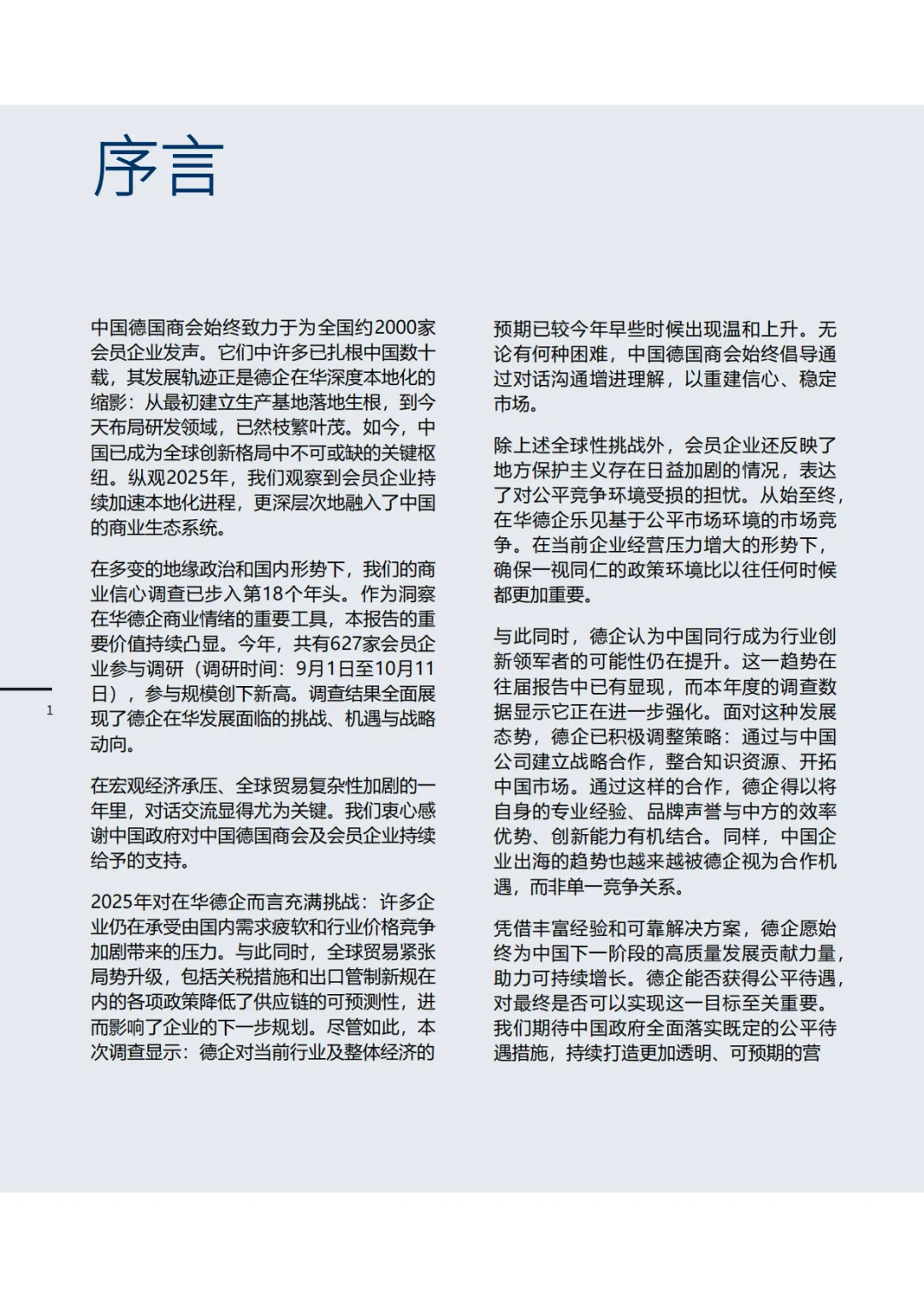 凭借丰富经验和可靠解决方案,德企愿始终为中国下一阶段的高质量发展贡献力量,助力可持续增长。德企能否获得公平待遇,对最终是否可以实现这一目标至关重要。我们期待中国政府全面落实既定的公平待遇措施,持续打造更加透明、可预期的营商环境。本年度报告提出了具体建议,以期增强投资者信心,为所有市场参与者创造长期价值。