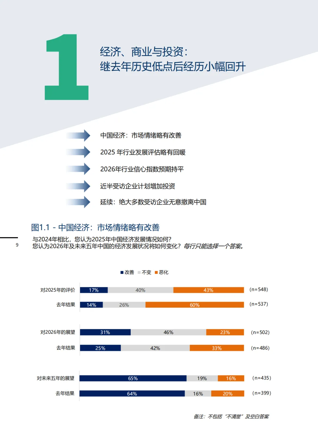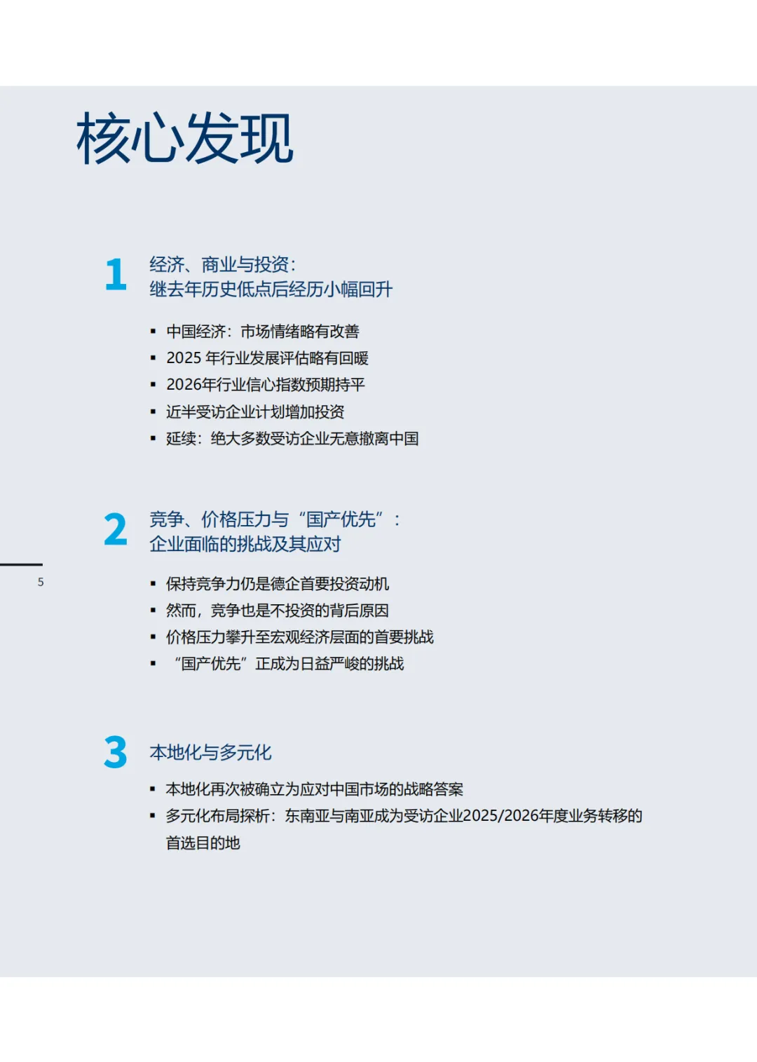 在此,我们谨向所有参与2025/26年度商业信心调查的会员企业,致以由衷的谢意。您所贡献的宝贵洞见,是我们准确传达德企社群声音、并使其产生影响力的基石。中国德国商会将继续致力于维护会员权益,促进中德商界融合。展望未来,我们将持续推动中德两国建立互利共赢的经济纽带。我们坚信,通过紧密合作,中德企业定能携手共进、同创辉煌。