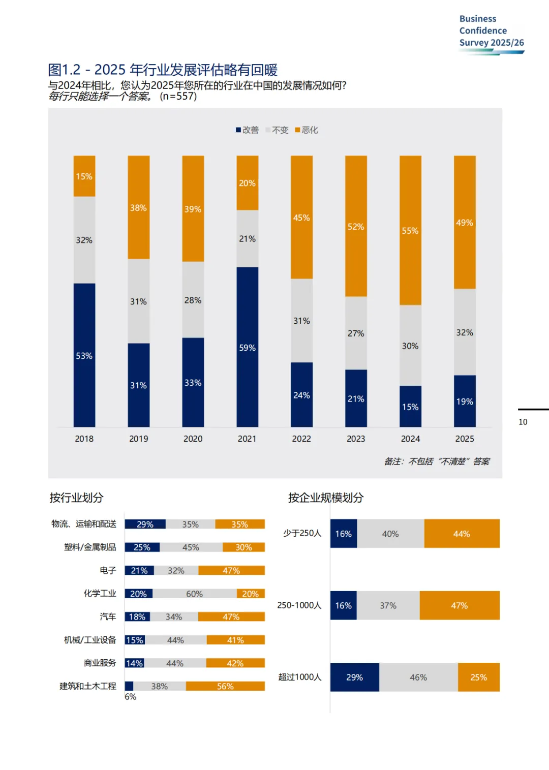 2025年对在华德企而言充满挑战:许多企业仍在承受由国内需求疲软和行业价格竞争加剧带来的压力。与此同时,全球贸易紧张局势升级,包括关税措施和出口管制新规在内的各项政策降低了供应链的可预测性,进而影响了企业的下一步规划。尽管如此,本次调查显示:德企对当前行业及整体经济的预期已较今年早些时候出现温和上升。无论有何种困难,中国德国商会始终倡导通过对话沟通增进理解,以重建信心、稳定市场。