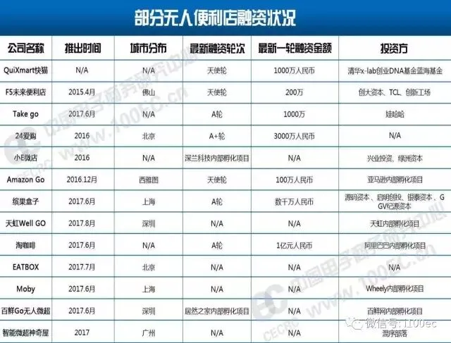 以下为中国电子商务研究中心(100EC.CN)汇总制作的部分无人便利店融资情况。