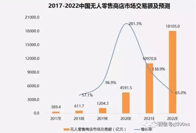 在整个市场规模上,目前还不算很大,根据中国电子商务研究中心得到的数据,预计今年只有389.4亿元。未来五年无人零售商店将会迎来发展红利期,2020年预计增长率可达281.3%,至2022年市场交易额将超1.8万亿元。