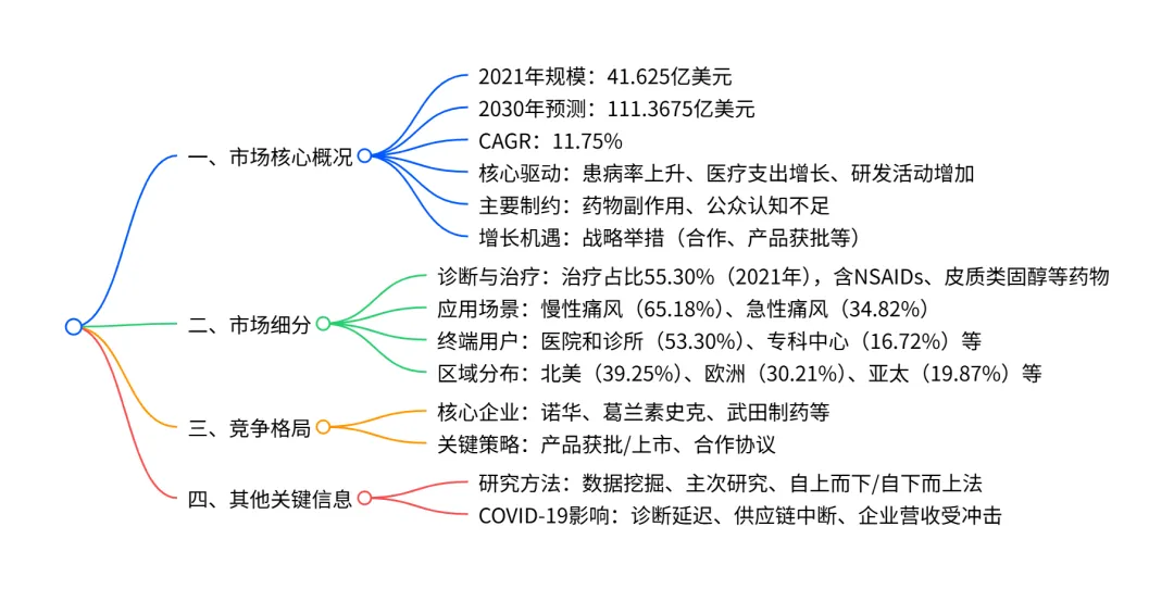 2021 年全球痛风市场规模达 41.625 亿美元,预计 2030 年将增至 111.3675 亿美元,复合年增长率(CAGR)为 11.75%;市场增长受痛风患病率上升、医疗支出增加及研发活动增多驱动,同时面临治疗药物副作用和公众认知不足的制约,战略举措增加带来增长机遇;北美为最大市场(2021 年占比 39.25%),亚太地区增速最快(CAGR 13.12%);治疗领域占主导地位,主要药物包括 NSAIDs、皮质类固醇等,医院和诊所是主要终端用户,诺华、葛兰素史克等为核心企业。