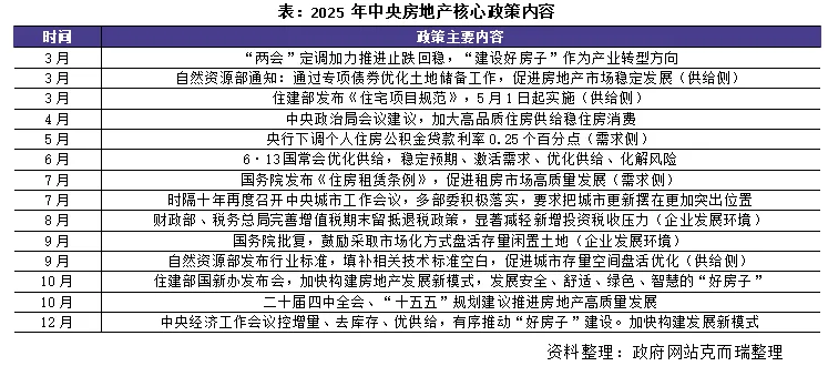 2025年是中国房地产市场自深度调整周期迈入企稳修复阶段的关键一年。政策由“托底纾困”转向“优化提振”, 主基调延续了“因城施策”的灵活框架,从年初延续前期“保交楼、稳需求、防风险”的托底措施,到年中以来,政策重心明显转向全面提振市场信心、激活合理住房需求。
