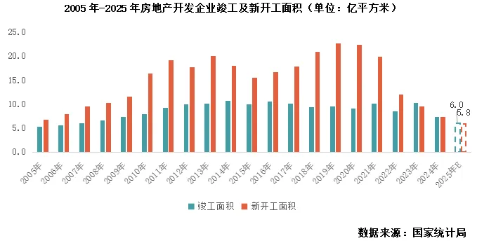 2025年房地产开发投资规模加速下行,预计全年同比下降17%,连续四年保持下降态势。这一变化主要源于两方面:一是新开工规模连续下行导致新建项目投资减少;二是开发投资与新开工降幅的差距持续拉近(2025年开发投资降幅较新开工降幅低4个百分点,差距较上年缩小8个百分点),反映出在建项目加速出清,相关投资快速回落,这也是行业摆脱旧库存桎梏、迈向新阶段的积极信号。