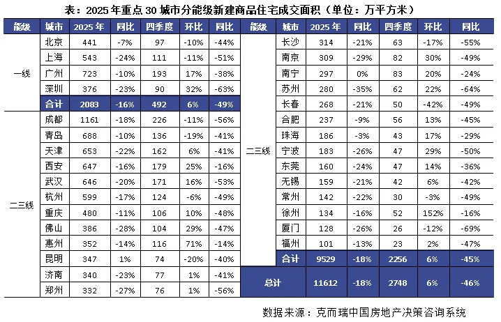 2025年新增供应持续缩量,成交规模同比再降18%,但降幅显著收窄。据克而瑞监测数据显示,全国重点30城市新建商品住宅新增供应面积已不足1亿平仅约9265万平方米,同比再减少9%,新房供应约束可见一斑,预计这种情况仍将在未来2-3年内持续存在,直至达成新的供求平衡。同样的数据显示,全国重点30城市新建商品住宅成交面积约1.16亿平方米。至此,全年新房供求比约0.81,已经连续三年保持在0.8左右,说明整体新房市场供不应求持续去库存。