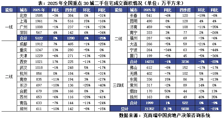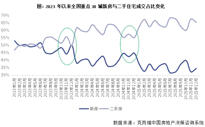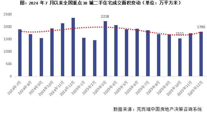 据克而瑞监测数据显示,2025年全国重点30城市二手住宅累计成交面积约2.14亿平方米,为新房面积的1.85倍,同比持平微增0.2%,再次创新2021年行业调整以来规模新高。