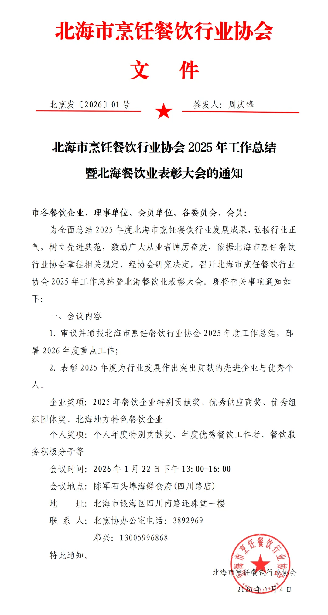 北海市烹饪餐饮行业协会2025年工作总结暨北海餐饮业表彰大会的通知