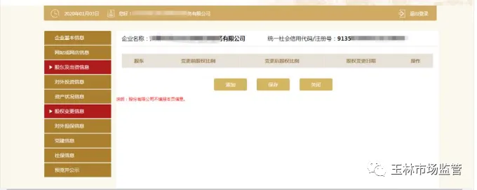 发生了股权、股东变更的企业,请在发生变更后20个工作日内登录年报系统, 点击“其它自行公示信息”,在股权变动信息栏目填写相关内容,保存并提交公示。