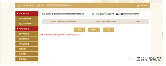 填写对外投资信息。点击左边的“对外投资信息”,之后再根据实际情况点击“添加”填写相关信息,填写完成后点击“保存”。如无对外投资情况的则无需填写此项信息。